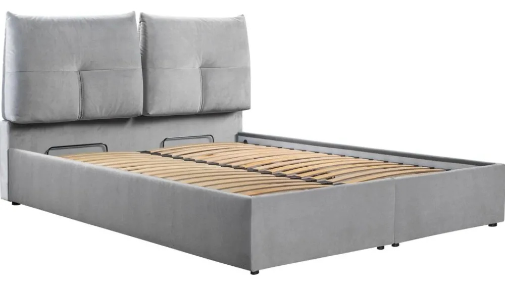 Model występuje w dwóch szerokościach – pod materac 140×200 oraz 160×200. W standardzie łóżko posiada praktyczny pojemnik na pościel. Stelaż na metalowej ramie + listwy drewniane, system zagęszczony (odległość między listwami: 3cm). Łatwe otwieranie zapewnią siłowniki gazowe. Materac nie jest wliczony w cenę łóżka.