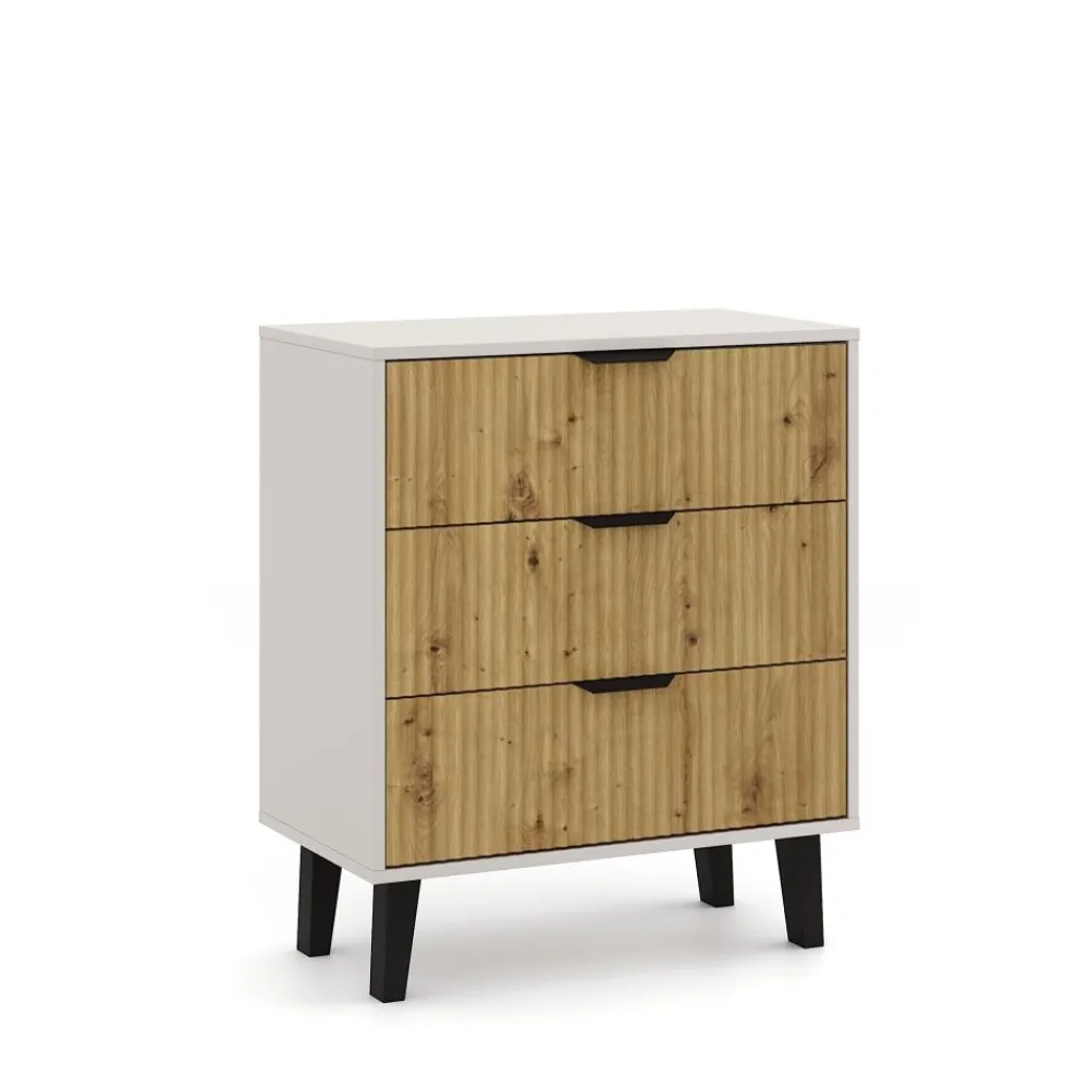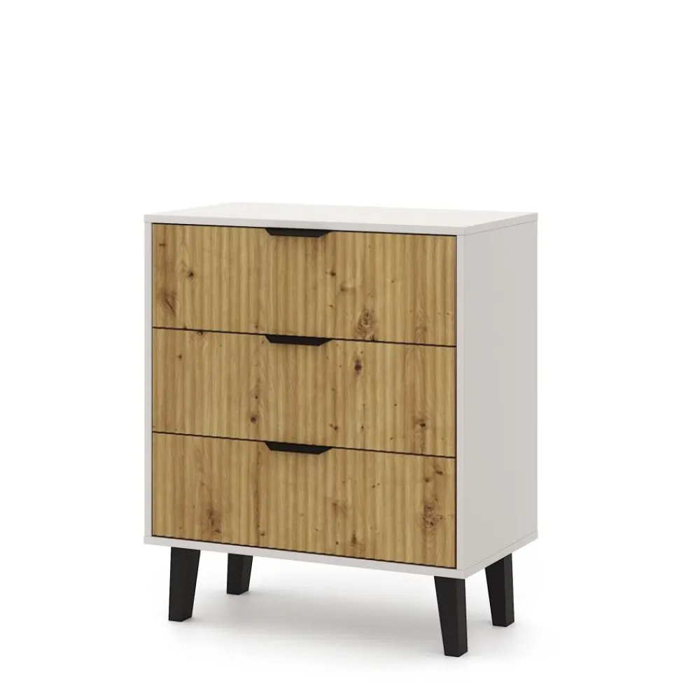 Komoda wyposażona jest w trzy pojemne szuflady, które zapewniają łatwy dostęp do przechowywanych rzeczy i pomagają zachować porządek. Idealnie sprawdzi się jako miejsce na bieliznę, dokumenty, drobne tekstylia czy codzienne akcesoria. Lekko pracujące prowadnice zwiększają komfort użytkowania, a solidne wykonanie zapewnia trwałość na lata.