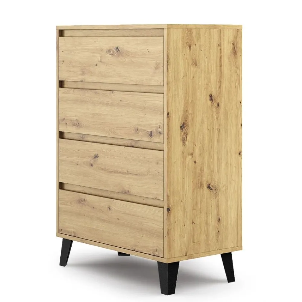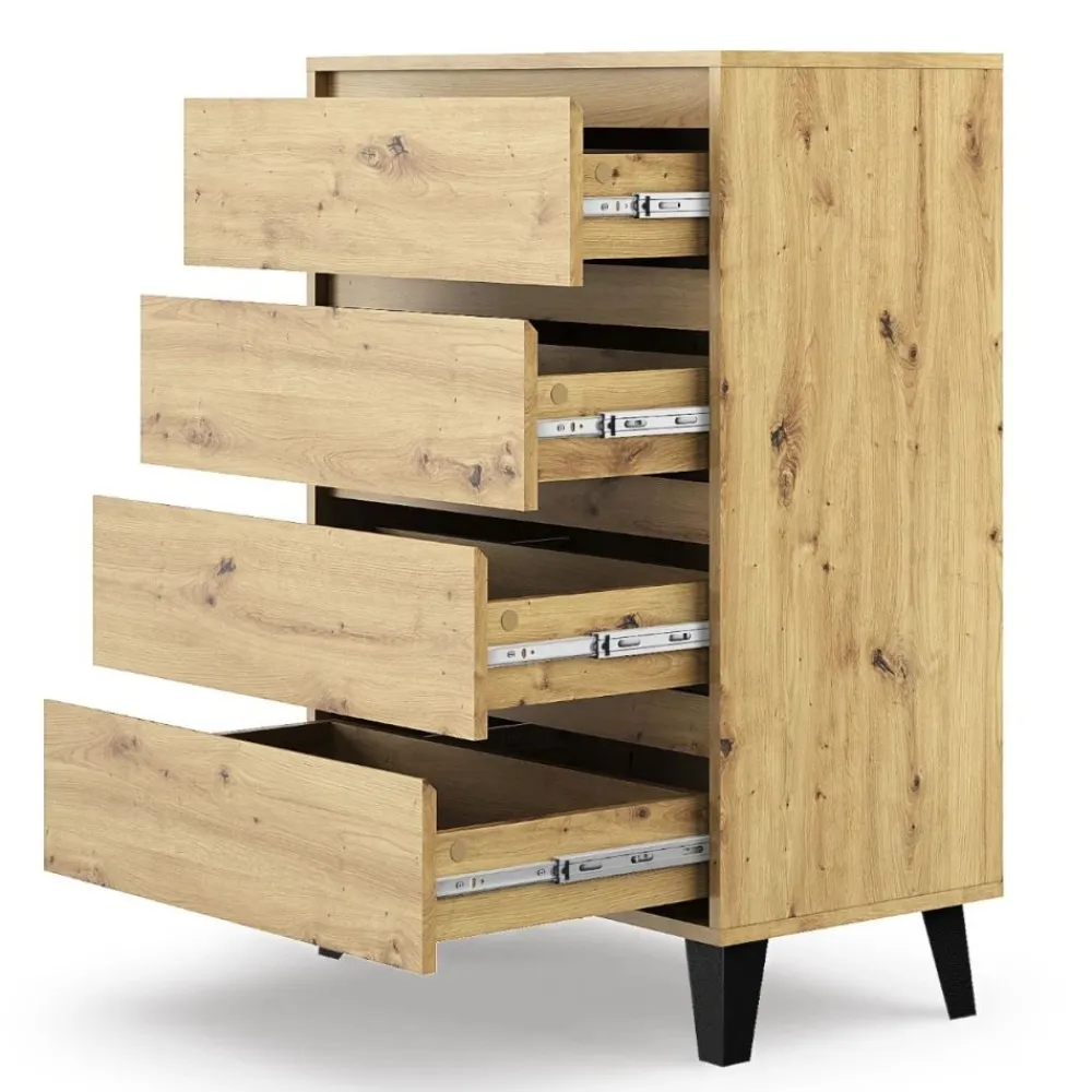 Kompaktowe wymiary i cztery pojemne szuflady sprawiają, że komoda BORG jest praktycznym rozwiązaniem do każdego pomieszczenia. Idealnie nadaje się do przechowywania różnych przedmiotów, pomagając utrzymać porządek i organizację w domu.