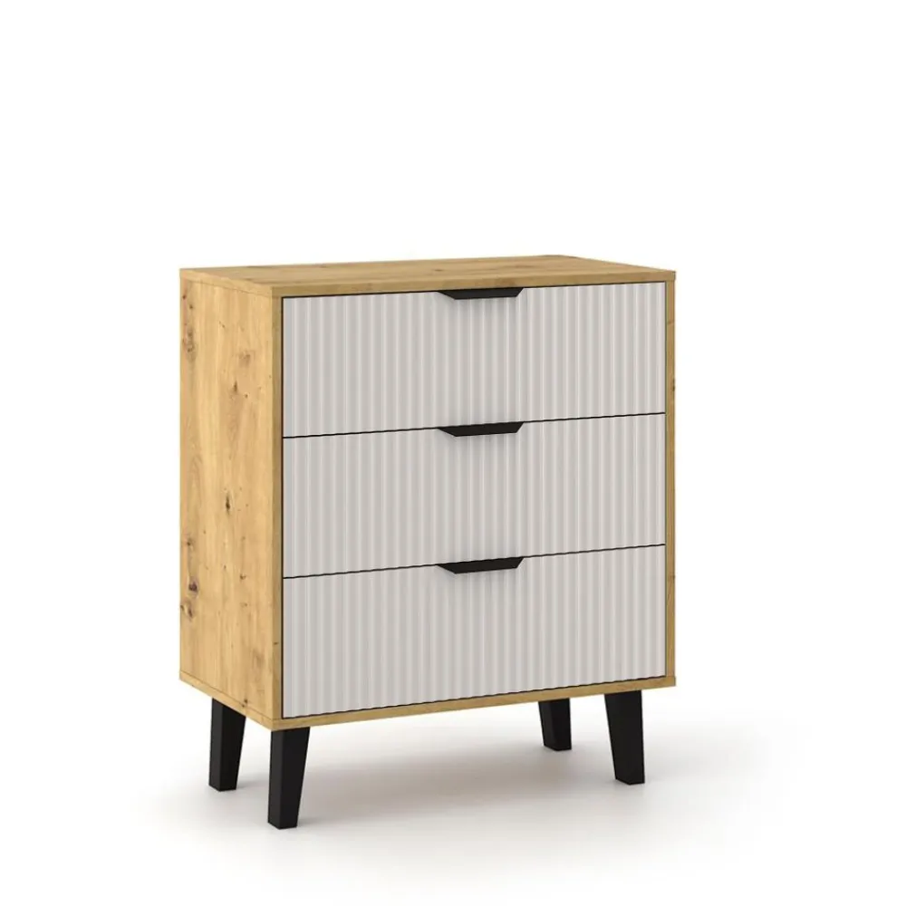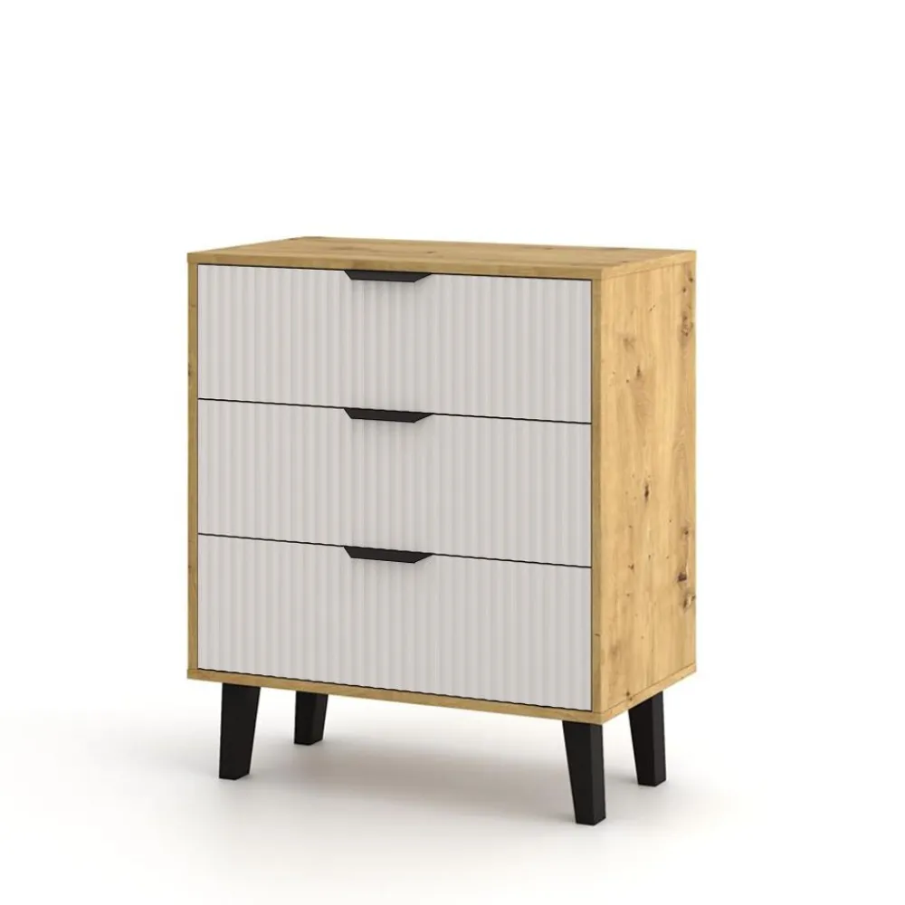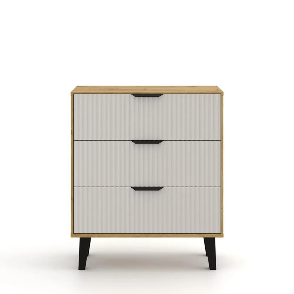 Komoda BORG DUO 3S w kolorze dębu artisan z ryflowanymi kaszmirowymi frontami to idealne połączenie funkcjonalności i minimalistycznego stylu. Jej subtelna forma i eleganckie wykończenie wprowadzają do wnętrza harmonię i lekkość, sprawiając, że mebel doskonale odnajduje się w nowoczesnych sypialniach, salonach oraz przedpokojach. Komoda BORG DUO 3S to wybór, który pasuje do osób ceniących prostotę, ale także subtelną elegancję, która nigdy nie wychodzi z mody.