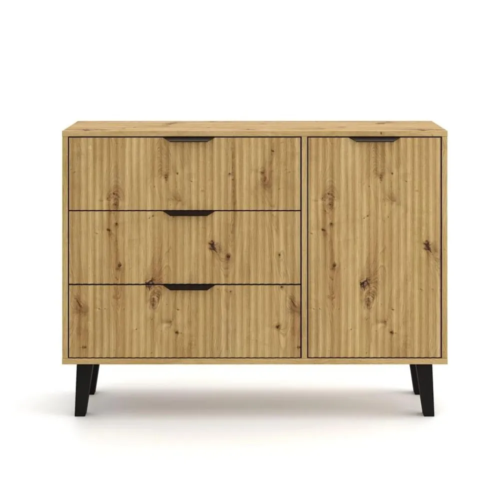 Jednym z flagowych elementów kolekcji jest duża komoda 1D3S, która oferuje imponującą ilość miejsca do przechowywania – idealna do sypialni, salonu czy przedpokoju. Przemyślany układ szafek i szuflad zapewnia wygodę i porządek w codziennym użytkowaniu.