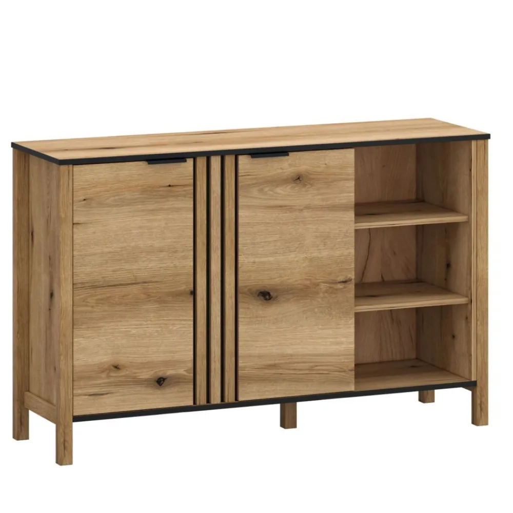 Dodatkowo, z prawej strony komody znajdują się trzy wnęki, które stanowią praktyczne miejsce do przechowywania różnych przedmiotów. Dzięki temu komoda nie tylko prezentuje się elegancko i estetycznie, ale również doskonale spełnia swoją funkcję użytkową, pomagając utrzymać porządek w salonie lub sypialni.