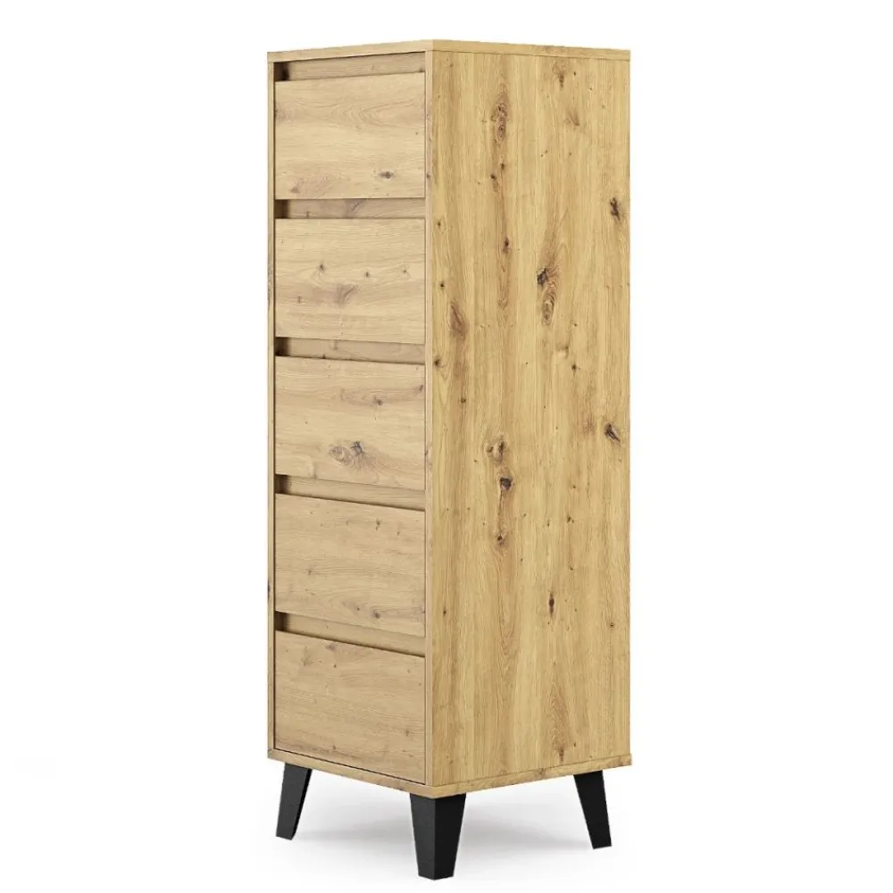 Komoda w kolorze dąb artisan z kolekcji Borg, która posiada 5 szuflad to idealne rozwiązanie dla tych, którzy poszukują funkcjonalnego i stylowego mebla do przechowywania. Dzięki swojej konstrukcji, zapewnia dużą przestrzeń do organizacji ubrań, bielizny, akcesoriów i dokumentów.