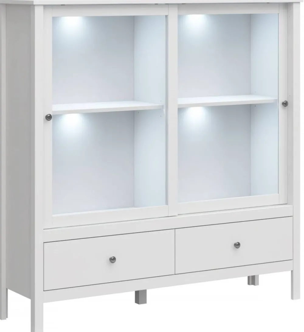 Witryna z szufladami i zamkniętymi półkami, wykonana została z wytrzymałej płyty MDF i meblowej laminowanej. Oświetlenie witryny dostępne jako opcja dodatkowa.