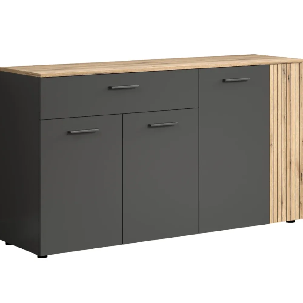 Blat wykonany z płyty laminowanej jest odporny na zarysowania i łatwy w pielęgnacji, co zapewnia wygodę podczas codziennego użytkowania. Drewniany dekor w odcieniu dąb evok nadaje mu przytulnego, naturalnego wyglądu, idealnie komponując się z grafitowym korpusem. Dzięki szerokości 150 cm masz do dyspozycji przestrzeń na dekoracje, oświetlenie czy ulubione dodatki. Blat komody może również pełnić funkcję praktycznej powierzchni na przedmioty, do których chcesz mieć szybki dostęp. To miejsce, które pozwoli Ci wprowadzić do wnętrza indywidualny styl.