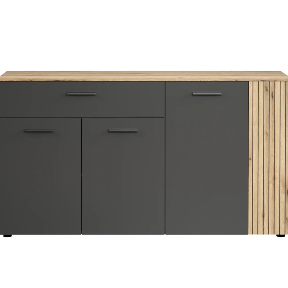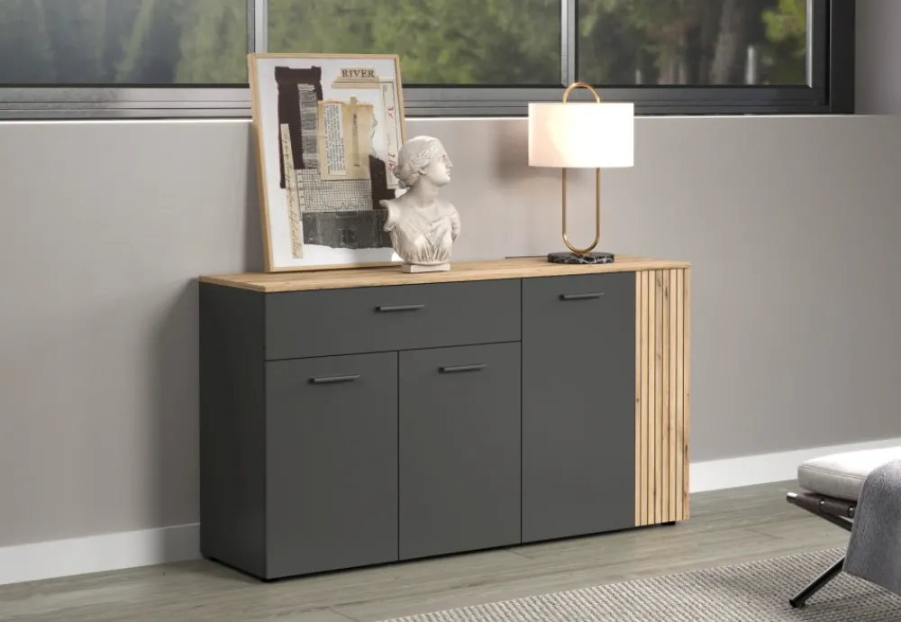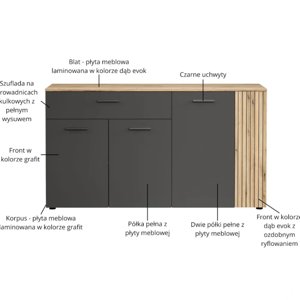 Komoda Esteban zachwyca eleganckimi, frezowanymi i patynowanymi ryflami, które nadają jej luksusowego charakteru. Połączenie dębu evok z grafitem tworzy harmonijną, nowoczesną kompozycję pasującą do salonu, jadalni i sypialni. Symetryczne zestawienie kolorów wizualnie porządkuje przestrzeń i sprawia, że mebel prezentuje się wyjątkowo estetycznie. To komoda, która nie tylko zdobi, ale także podkreśla styl całego pomieszczenia. Jeśli szukasz mebla z efektem „wow”, Esteban będzie idealnym wyborem do Twojego domu.