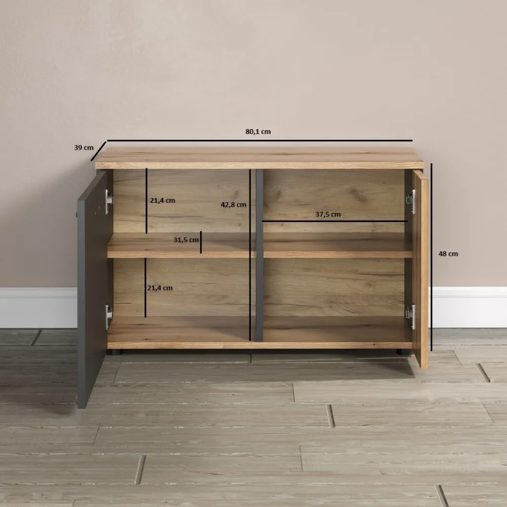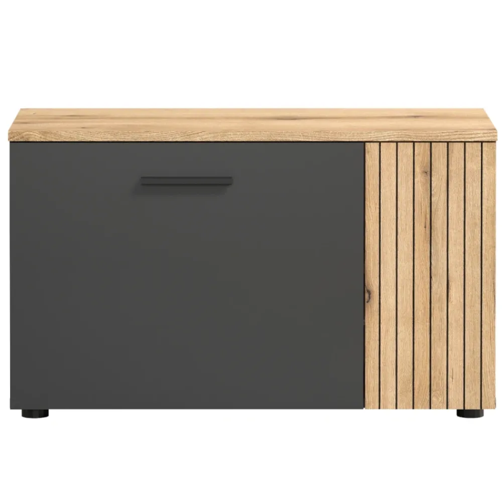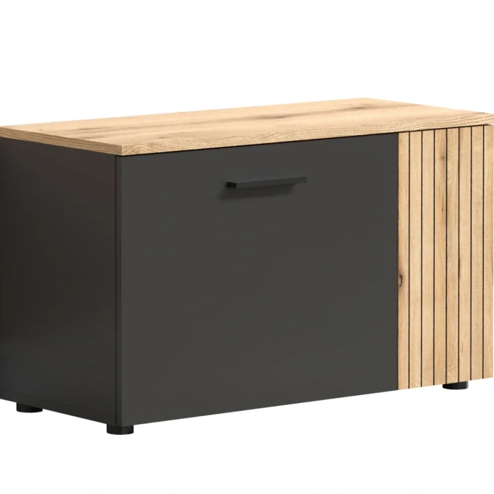 Szafka na buty Esteban łączy eleganckie wykończenie w kolorze grafit/dąb evok z funkcjonalną konstrukcją, dzięki czemu świetnie sprawdzi się w przedpokoju, wiatrołapie lub garderobie. Dwudrzwiowa forma pozwala wygodnie uporządkować obuwie, zachowując estetyczną przestrzeń w strefie wejściowej. Jedno ze skrzydeł posiada dekoracyjne lamelowe wykończenie, które nadaje meblowi wyjątkowego charakteru i idealnie komponuje się z pozostałymi elementami kolekcji Esteban. Dzięki kompaktowym wymiarom 80,1 × 48 × 36 cm szafka zmieści się nawet w mniejszych przestrzeniach. To mebel, który dodaje stylu i porządku już od progu.
