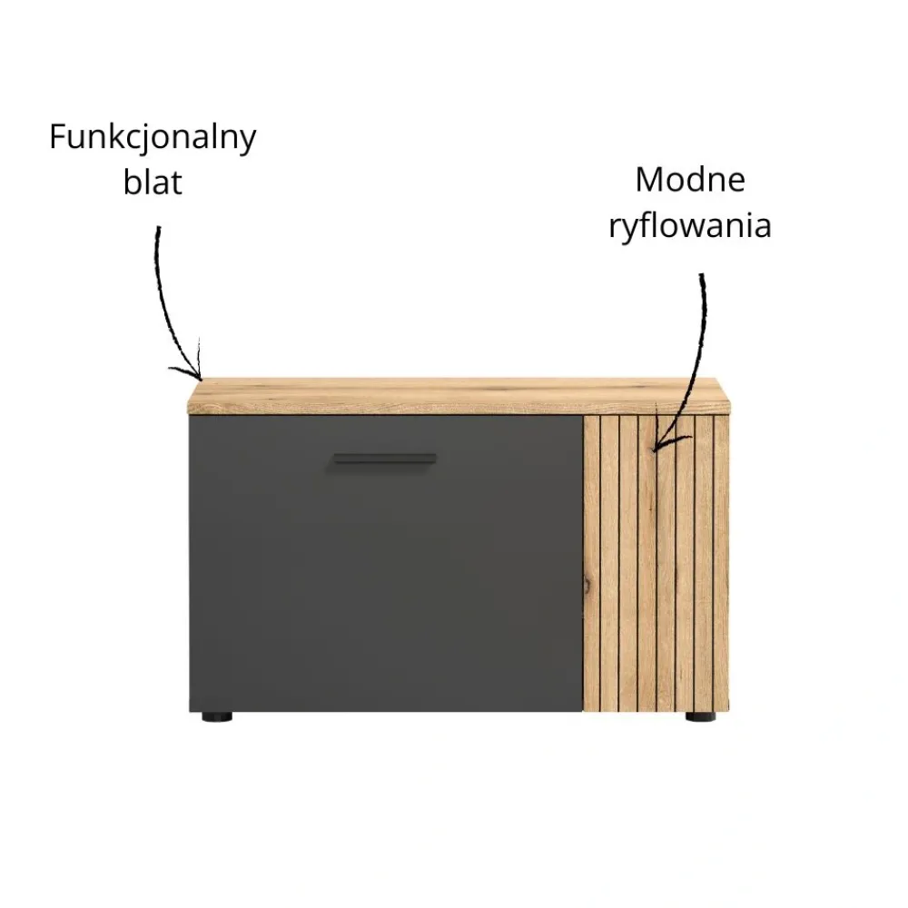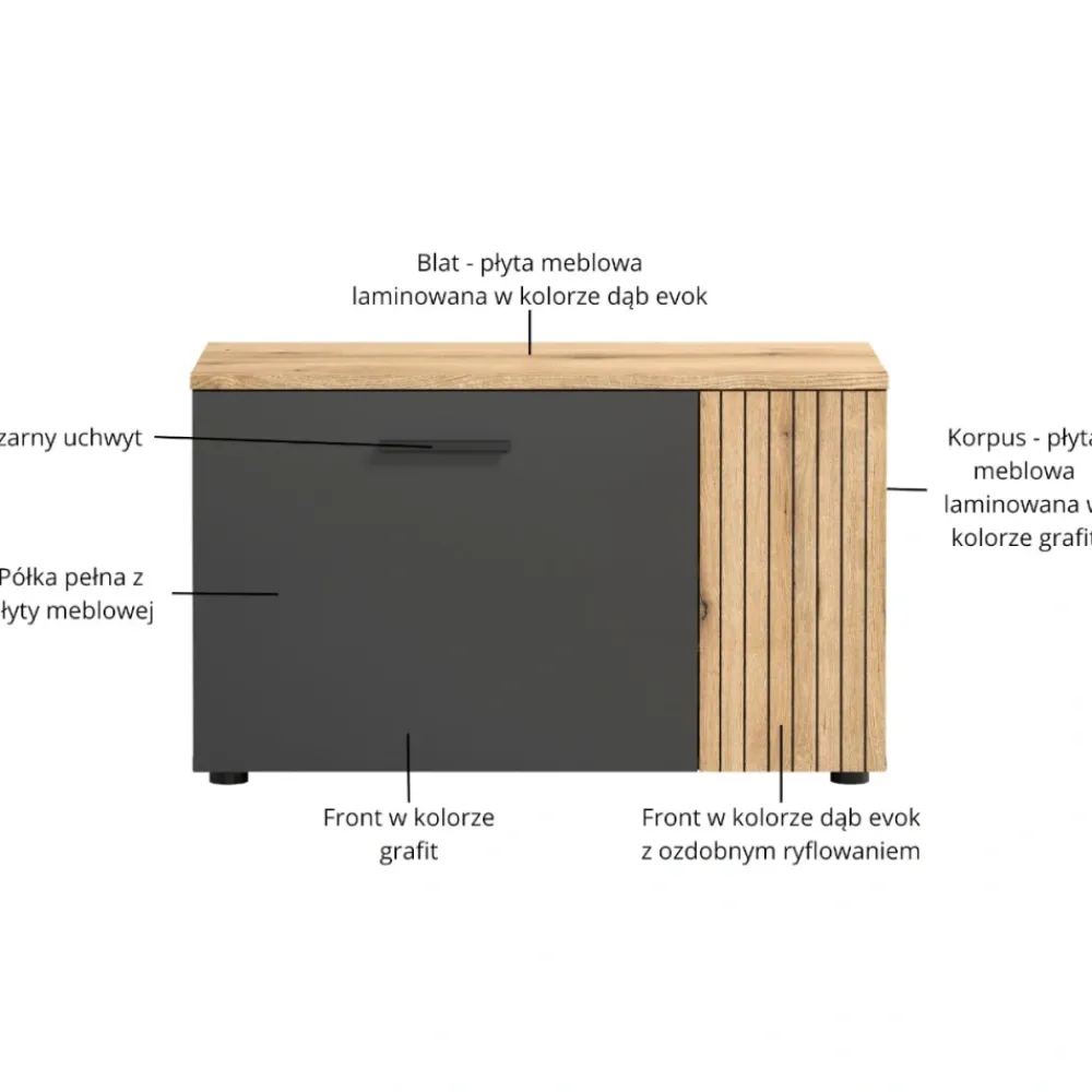 Model świetnie komponuje się z szeroką gamą mebli z tej kolekcji Esteban – komodami, szafkami RTV, szafami, witrynami, wieszakiem oraz półkami. Dzięki temu możesz stworzyć jednolitą aranżację przedpokoju, która jest zarówno praktyczna, jak i stylowa. Kolorystyka grafit/dąb evok sprawia, że szafka doskonale pasuje zarówno do jasnych, jak i ciemniejszych przestrzeni. To idealny wybór dla osób, które chcą urządzić swój dom w sposób spójny i elegancki. Szafka na buty Esteban wprowadza równowagę między praktycznym przechowywaniem a nowoczesnym wyglądem.