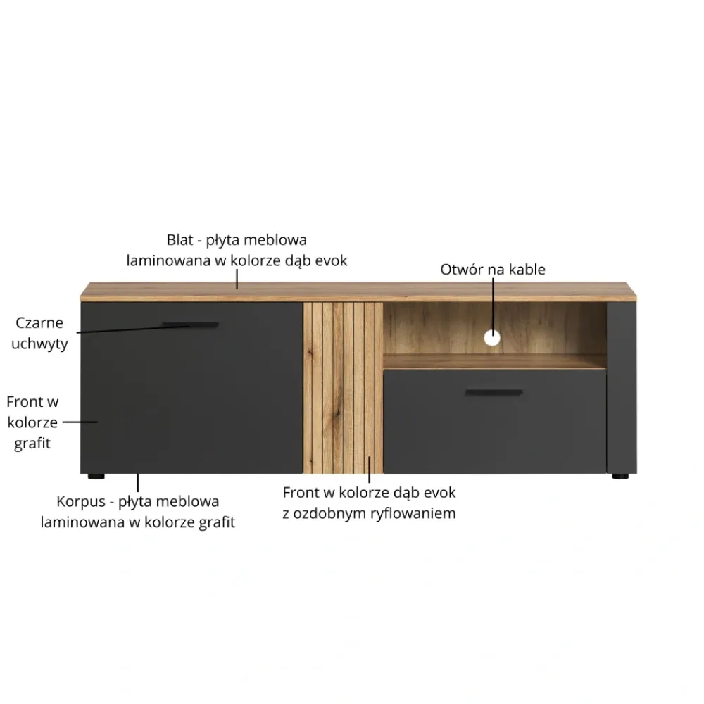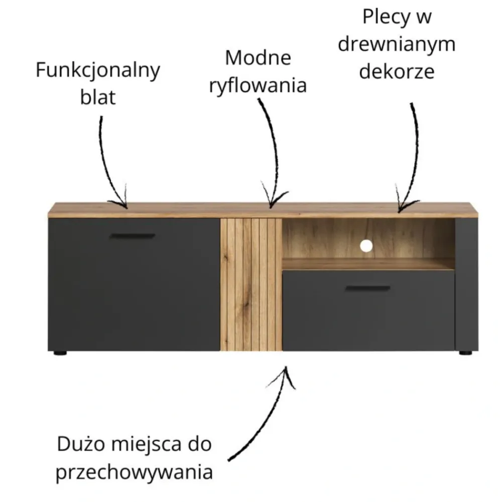 Model posiada jedne szafkę, jedną pojemną szufladę oraz jedną otwartą wnękę, co pozwala przechować zarówno sprzęt, jak i akcesoria multimedialne. Szuflada wyposażona jest w prowadnice kulkowe z pełnym wysuwem, co gwarantuje wygodne użytkowanie i łatwy dostęp do zawartości. Drzwiczki umożliwiają ukrycie elementów, które nie powinny być widoczne na co dzień, zachowując estetykę strefy RTV. Otwarta wnęka posiada otwór techniczny do przeprowadzenia kabli, dzięki czemu instalacja sprzętu jest szybka i uporządkowana. To rozwiązanie idealne dla osób ceniących praktyczność i minimalistyczny porządek.