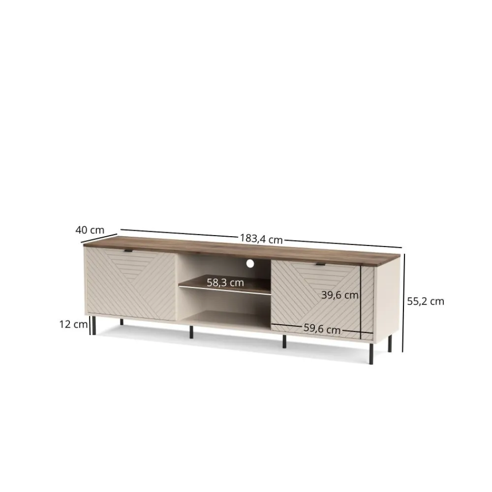 Szafka RTV EVO 2D/180 EO-08 to połączenie nowoczesnego designu z eleganckim wykończeniem, które doskonale wpisuje się w styl każdego salonu. Korpus w kolorze kaszmiru i blat w odcieniu dąb castello tworzą ciepły, harmonijny wygląd, który wprowadza do wnętrza przytulną atmosferę. Ryflowane fronty wykonane z płyty MDF nadają meblowi unikalny charakter, dodając mu głębi i wyrafinowania. Taki design sprawia, że szafka RTV EVO 2D/180 EO-08 staje się nie tylko funkcjonalnym elementem wyposażenia, ale również stylową ozdobą salonu. Dzięki swojej elegancji i starannemu wykonaniu, mebel ten doskonale komponuje się z różnorodnymi aranżacjami wnętrz, od nowoczesnych po bardziej klasyczne. Szafka RTV podkreśli estetykę Twojego salonu, jednocześnie spełniając wszystkie oczekiwania co do funkcjonalności.