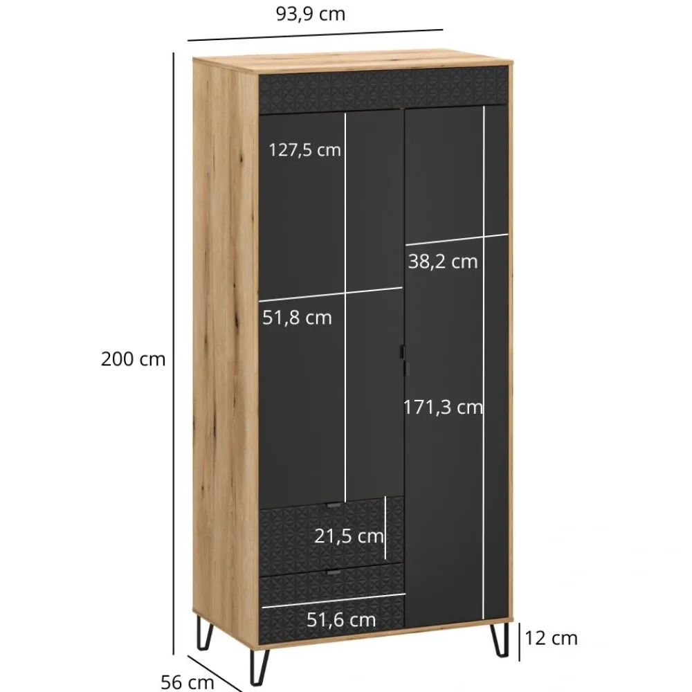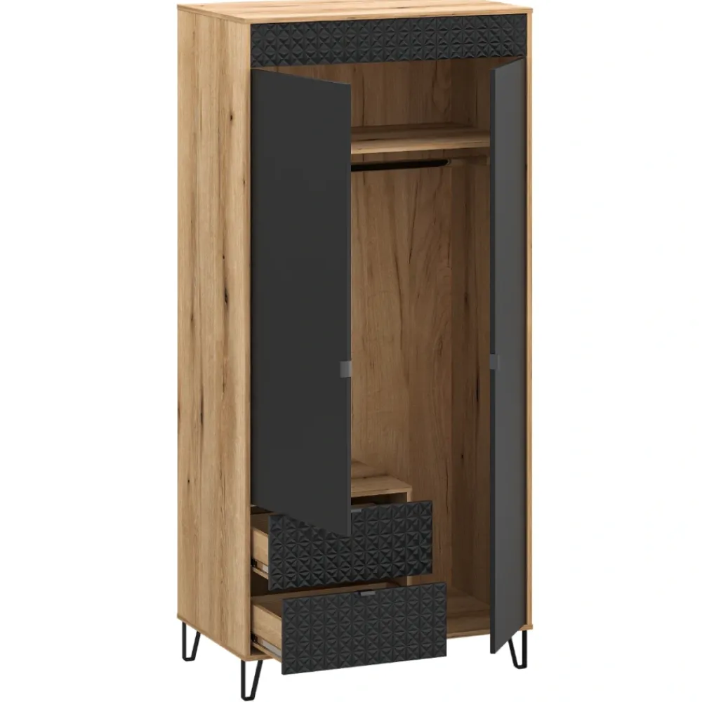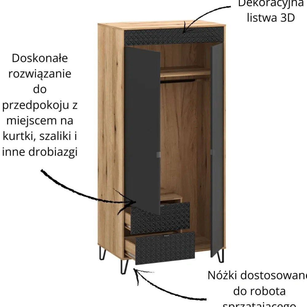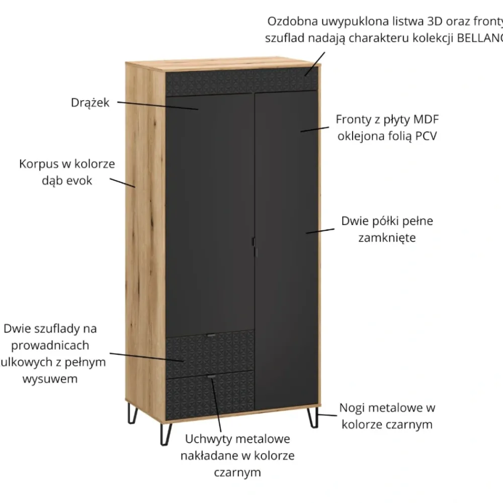 Szafa Bellano 2D2S to nowoczesny mebel zaprojektowany z myślą o funkcjonalnym i estetycznym przechowywaniu odzieży. Dwudrzwiowa forma została uzupełniona o dwie praktyczne szuflady, które zwiększają możliwości organizacyjne wnętrza. Modne połączenie koloru dąb evok i czerni doskonale wpisuje się w aktualne trendy aranżacyjne. Dekoracyjne fronty z ozdobną listwą 3D nadają szafie wyrazisty, designerski charakter. To mebel, który sprawdzi się zarówno w sypialni, jak i w nowoczesnej garderobie. Szafa Bellano doskonale komponuje się z pozostałymi bryłami z tej samej kolekcji.