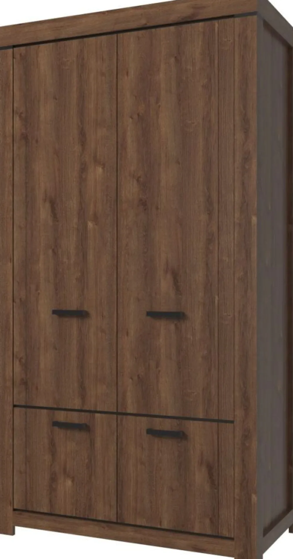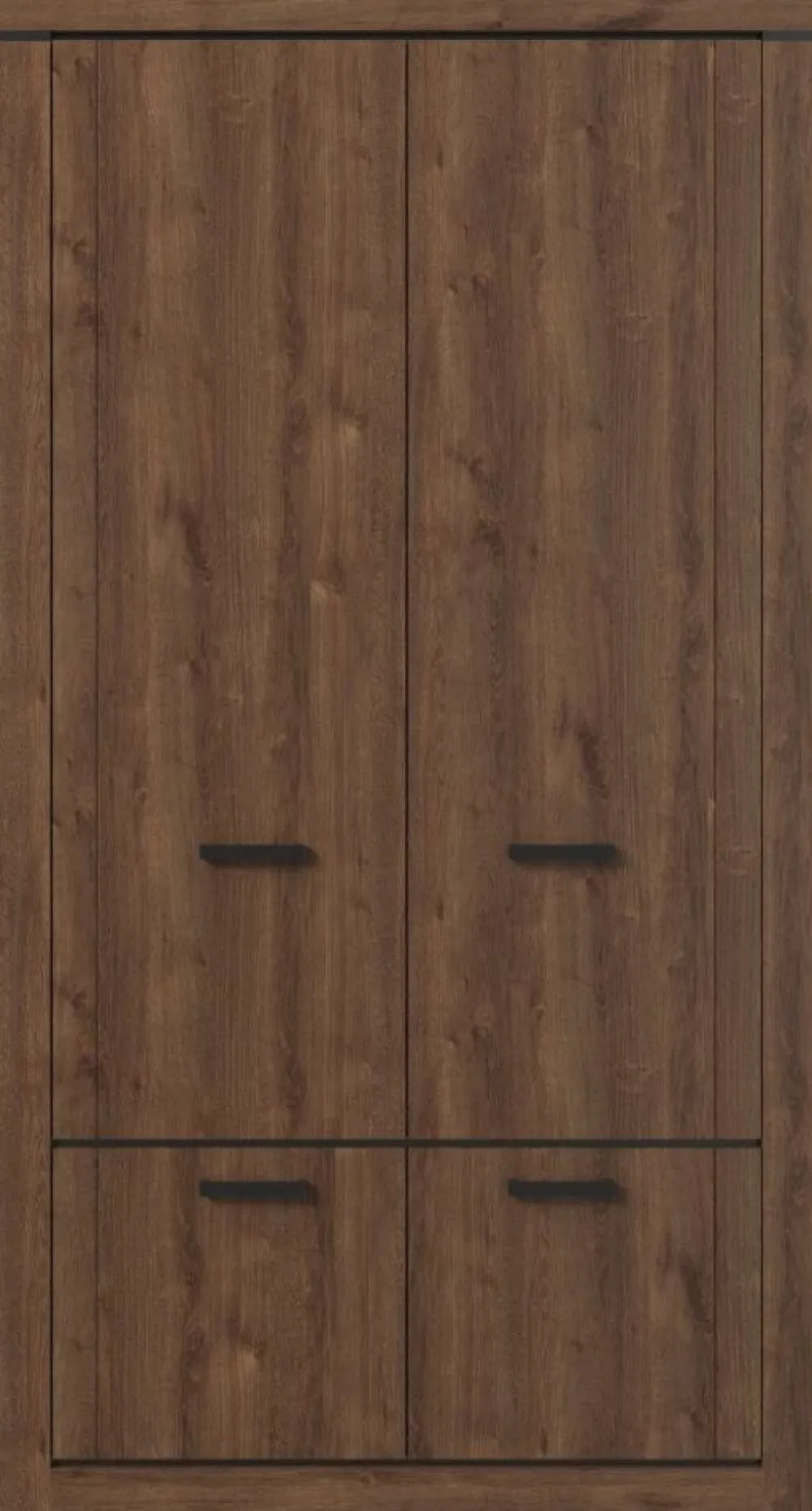 Duża szafa posiada dwie duże półki w górnej i dolnej części mebla oraz drążek na ubrania. Wykonana została z wytrzymałej płyty meblowej laminowanej.