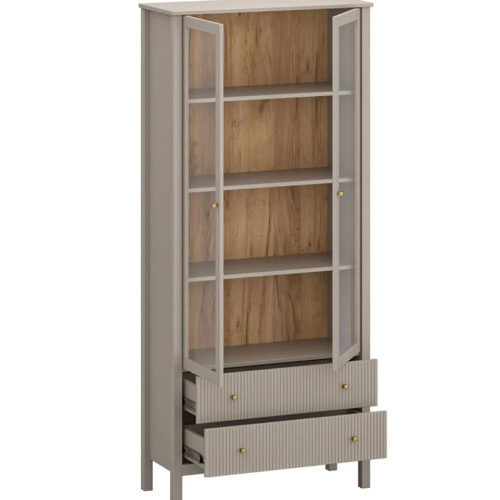 Ta duża witryna do salonu to mebel, który wzbogaci wnętrze o skandynawski styl i nowoczesną elegancję. Przeszklona szafka pozwala na efektowne wyeksponowanie ozdób, a dwie ryflowane szuflady z łatwością pomieszczą wszystkie potrzebne akcesoria. Wysokie nóżki dodają lekkości konstrukcji, a także ułatwiają sprzątanie, co jest praktyczne w codziennym użytkowaniu. Złote uchwyty podkreślają wyjątkowy charakter witryny, a jej przestronny format zapewnia mnóstwo miejsca na przechowywanie. To witryna do salonu, która łączy w sobie estetykę i wygodę, stając się centralnym punktem wnętrza.