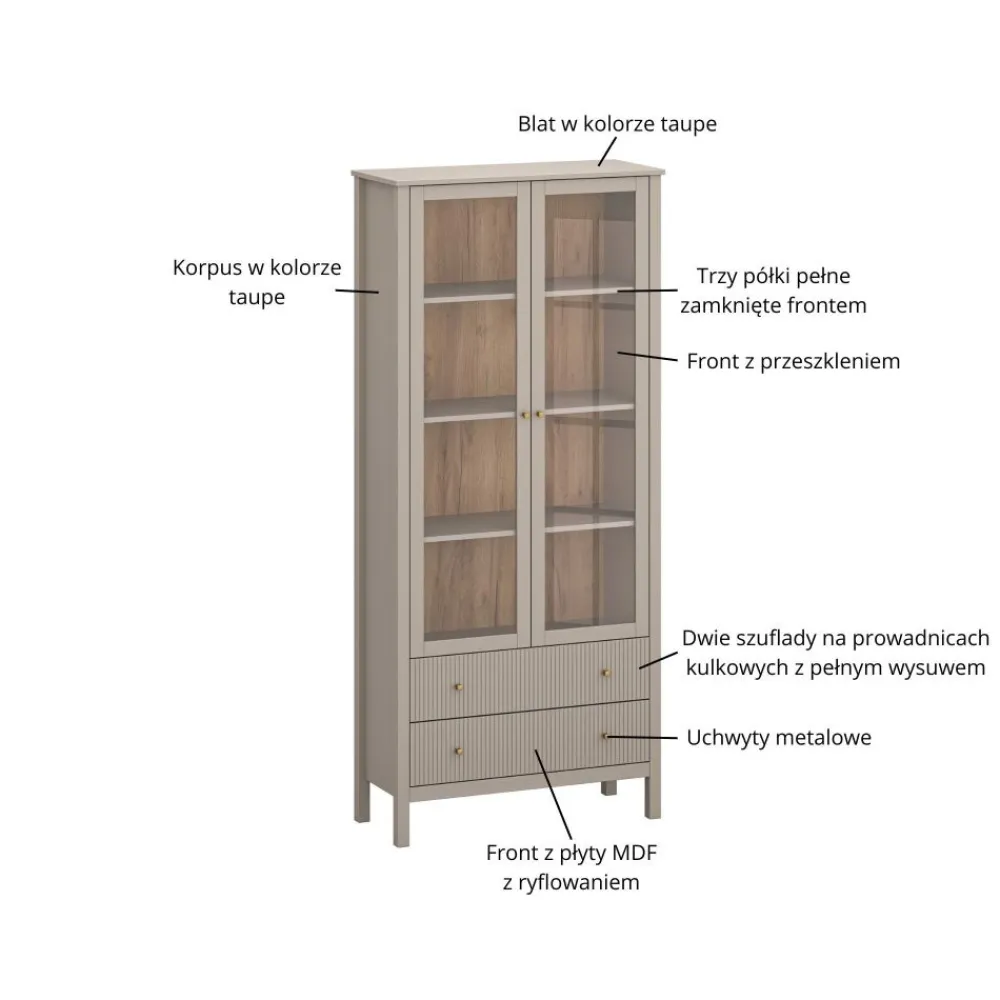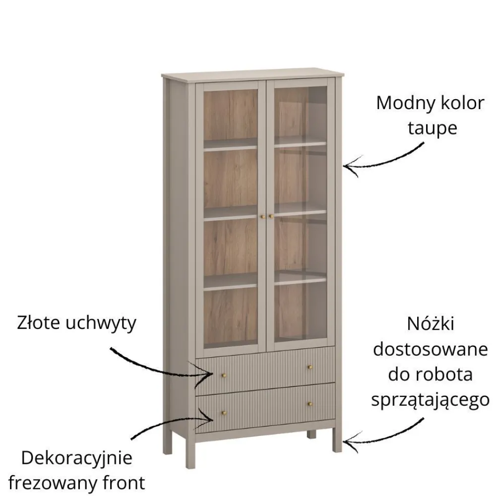 Ta duża witryna do jadalni łączy w sobie funkcjonalność i elegancję, doskonale komponując się z nowoczesnym wystrojem wnętrz. Przeszklona szafka zapewnia idealną przestrzeń na eksponowanie pięknych naczyń, szkła czy dekoracji, które wprowadzą do wnętrza przytulny akcent. Dwie przestronne szuflady z ryflowanymi frontami oferują mnóstwo miejsca do przechowywania, co pozwala na utrzymanie porządku i łatwy dostęp do drobniejszych akcesoriów. Złote uchwyty podkreślają nowoczesny charakter witryny, dodając jej subtelnego luksusu. Dzięki wysokim nóżkom witryna wygląda lekko i jest łatwa w utrzymaniu czystości, co czyni ją idealnym wyborem do jadalni.