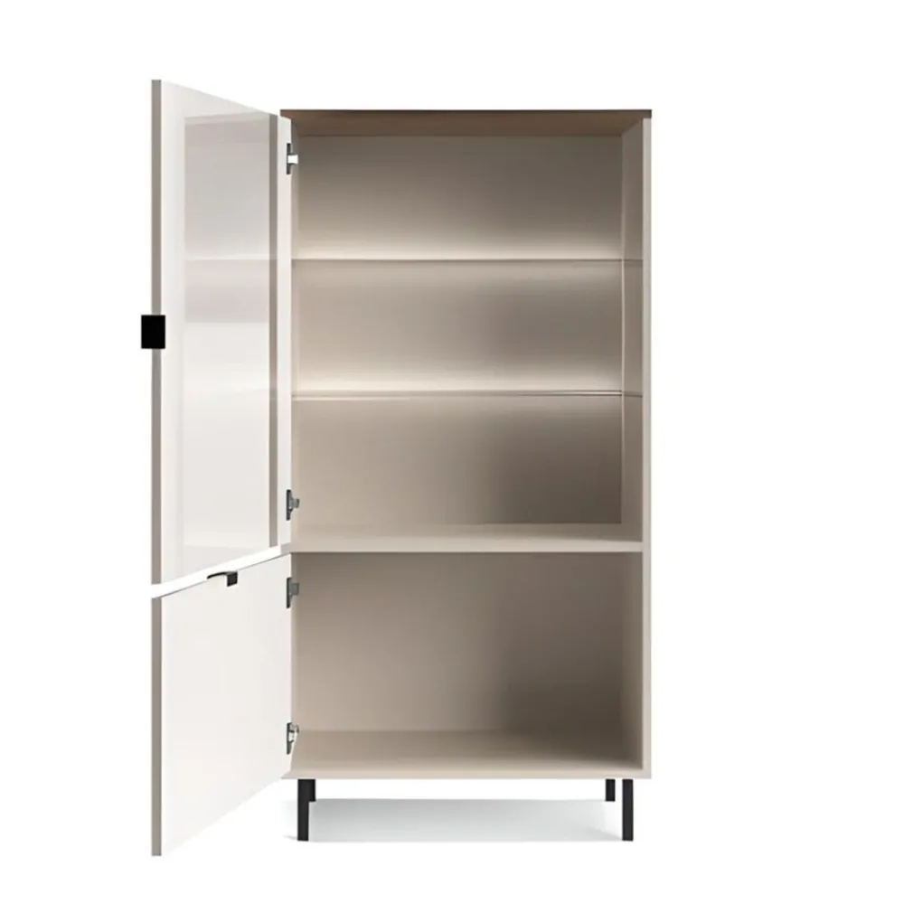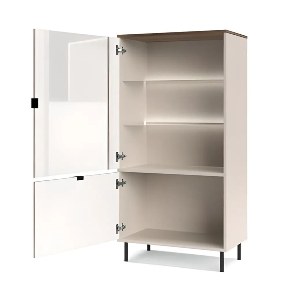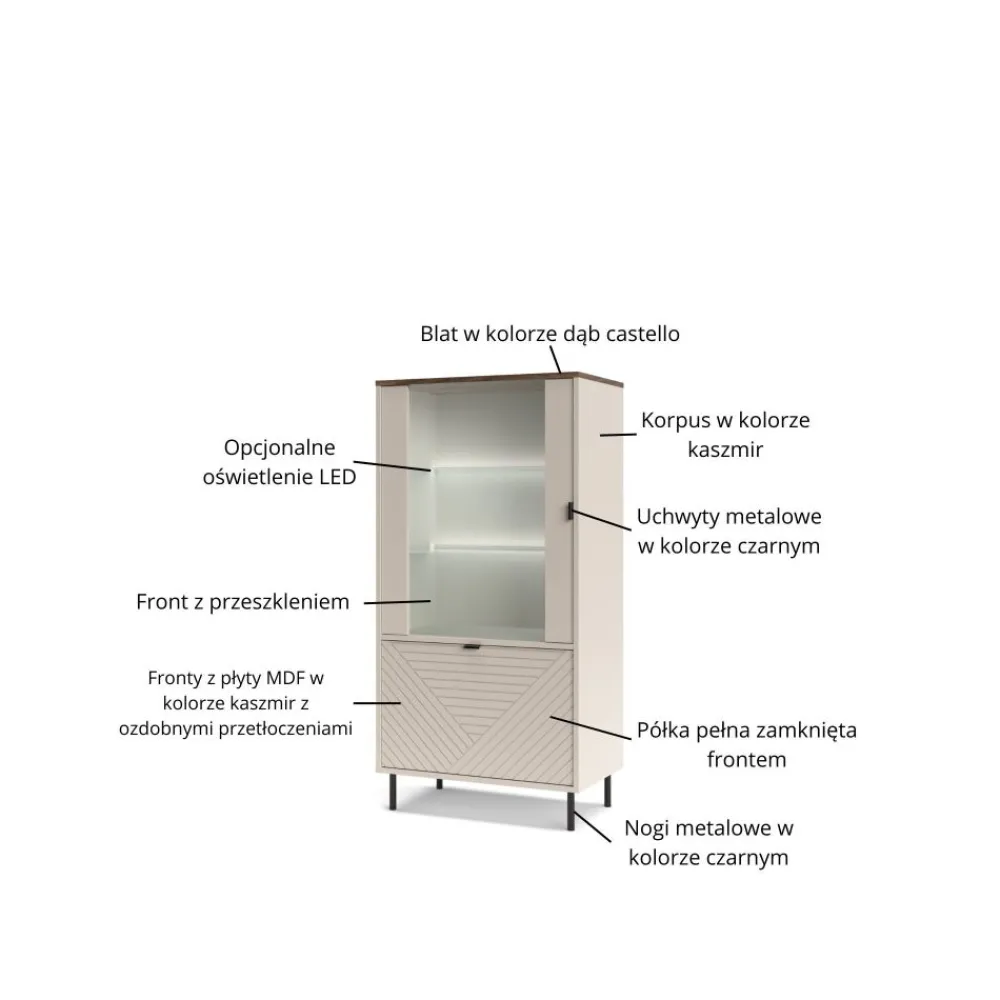 Witryna EVO 1D1W EO-10 oferuje opcję montażu oświetlenia LED, które wprowadzi do Twojego salonu wyjątkowy nastrój i dodatkowo podkreśli piękno eksponowanych przedmiotów. Delikatne światło LED zamontowane przy szklanych półkach subtelnie oświetli wnętrze witryny, tworząc przytulną i elegancką atmosferę. To doskonały sposób na wyeksponowanie dekoracji, szklanej zastawy czy innych cennych przedmiotów, które chcesz wyróżnić, szczególnie wieczorami. Oświetlenie LED nie tylko zwiększa funkcjonalność witryny, ale także dodaje jej nowoczesnego charakteru, czyniąc ją jeszcze bardziej atrakcyjną. Dzięki tej opcji Twoja witryna stanie się nie tylko praktycznym meblem, ale również efektowną ozdobą wnętrza, która przyciąga wzrok i tworzy wyjątkową atmosferę w Twoim salonie. To detal, który podkreśla unikalność Twojego wnętrza i dodaje mu wyjątkowego uroku. Oświetlenie możesz dokupić jako opcja dodatkowa podczas składania zamówienia.