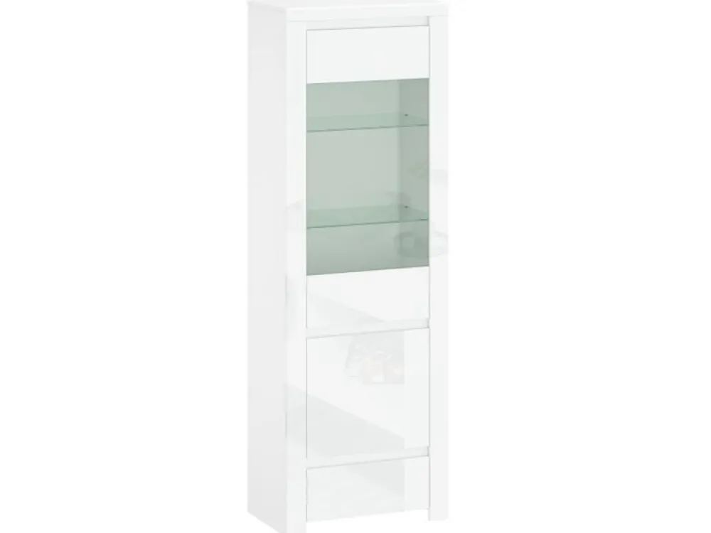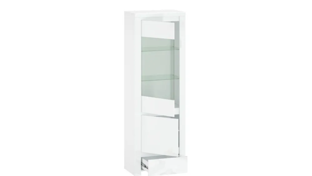 Witryna z kolekcji Lingo – wysoka, smukła, ze szklanymi półkami, z szafką i szufladą. Tak w kilku słowach można napisać jaka jest właśnie ta witryna od Mebelbos. Przeznaczenie jej też może być wielorakie, możesz w niej eksponować porcelanę, szklane lub kryształowe naczynia, kolekcje, pamiątki, czy też książki. Na dole bryły mebla dodatkowo masz do dyspozycji szufladę, w której możesz ukryć wszelkie drobne przedmioty. Witryny idealnie uzupełniają takie pomieszczenia jak: pokój dzienny, korytarz, salon, sypialnia, gabinet, home office, pokój młodzieżowy, a nawet jadalnia. Sama kolekcja Lingo jest tak zaprojektowana, że usatysfakcjonuje każdego wielbiciela, który lubi nienaganna prostotę, ale w nowoczesnej odsłonie, a klasyczna forma i uniwersalny, biały kolor daje wiele możliwości w urządzanie wnętrz w Twoim domu lub mieszkaniu.