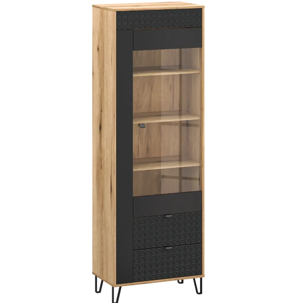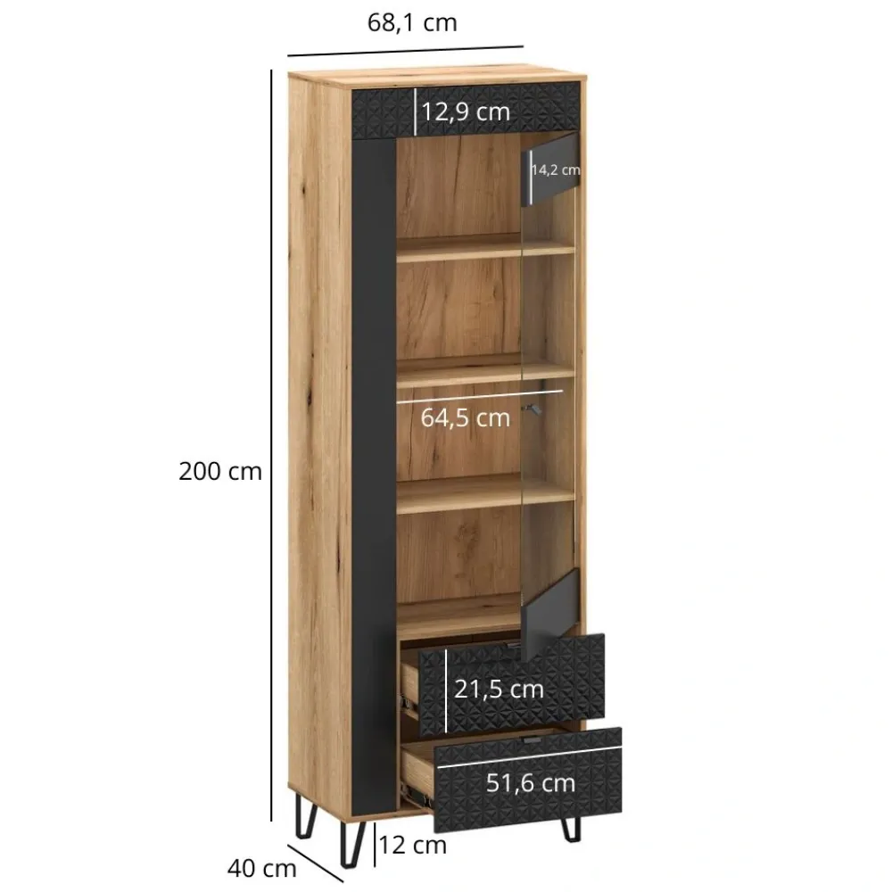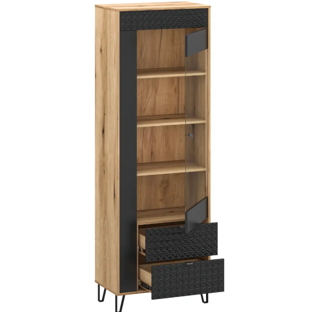 Wąska witryna Bellano o wysokości 200 cm i szerokości 68 cm to idealne rozwiązanie do nowoczesnych salonów, jadalni oraz stref dziennych. Smukła forma pozwala maksymalnie wykorzystać przestrzeń nawet w mniejszych pomieszczeniach. Połączenie koloru dąb evok i czerni nadaje bryle elegancki, ponadczasowy charakter. Przeszklona część witryny subtelnie eksponuje zawartość, nie przytłaczając aranżacji. Dekoracyjne fronty z ozdobną listwą 3D podkreślają spójność z całą kolekcją Bellano. To mebel, który łączy funkcję przechowywania z efektowną prezentacją.