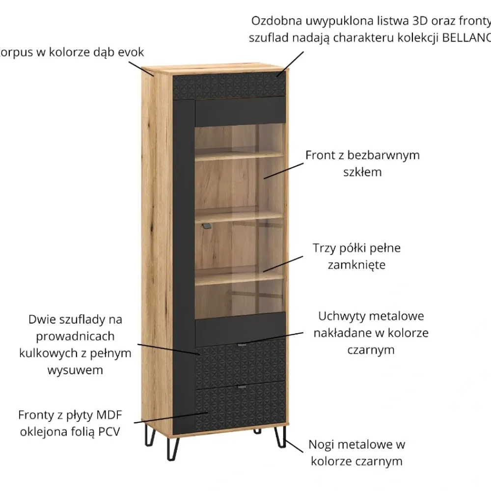 Witryna Bellano została osadzona na wysokich, metalowych nogach o wysokości 12 cm, które nadają jej nowoczesnej lekkości i eleganckiego charakteru. Podwyższona konstrukcja sprawia, że mebel nie przytłacza wnętrza, nawet przy wysokości 200 cm. Taka wysokość nóżek umożliwia swobodną pracę robota sprzątającego oraz znacznie ułatwia utrzymanie czystości pod witryną. Metalowe elementy gwarantują stabilność całej bryły i odporność na codzienne użytkowanie. Czarne wykończenie nóg idealnie komponuje się z detalami frontów oraz kolorystyką dąb evok i czerń. To praktyczne i estetyczne rozwiązanie, które podkreśla nowoczesny charakter kolekcji Bellano.