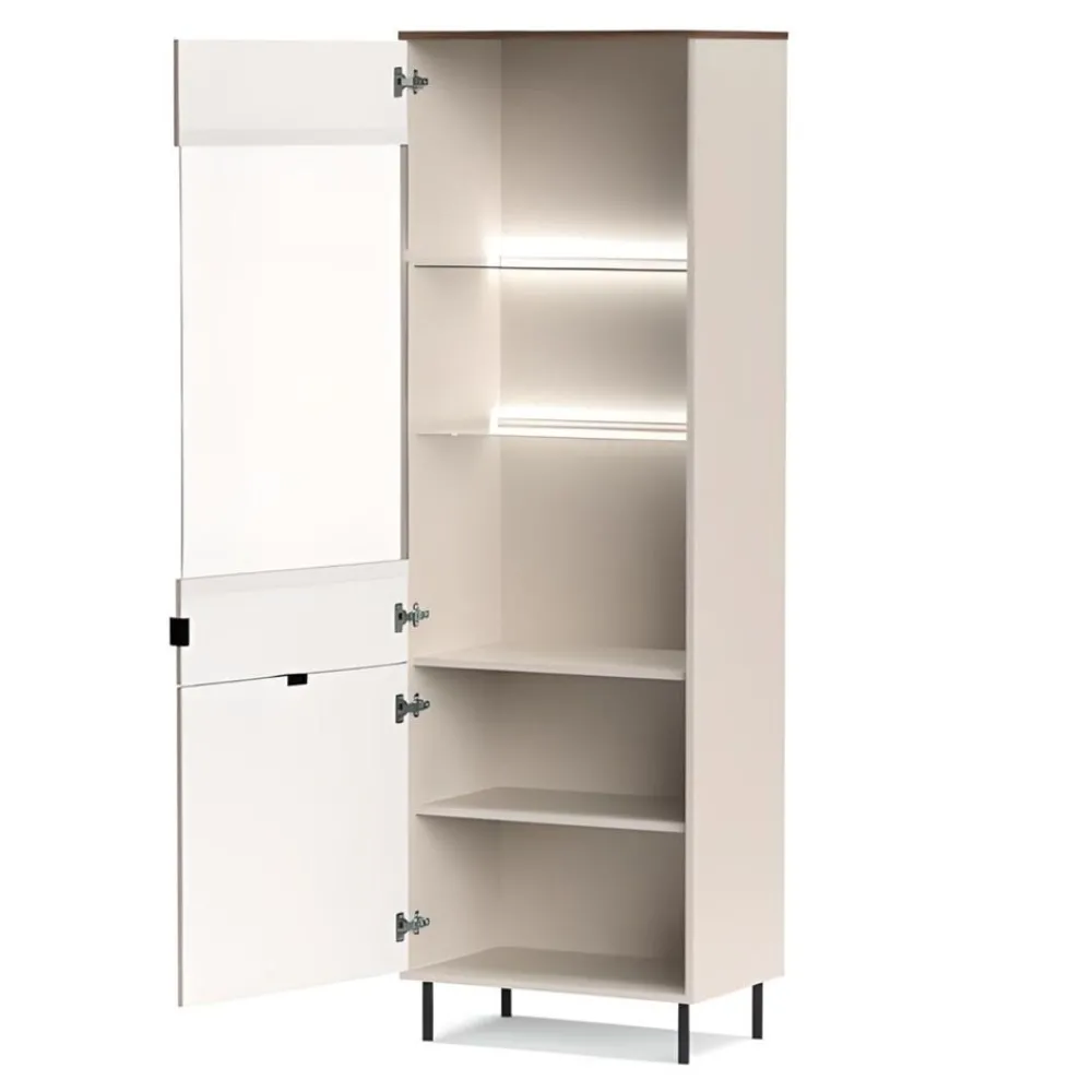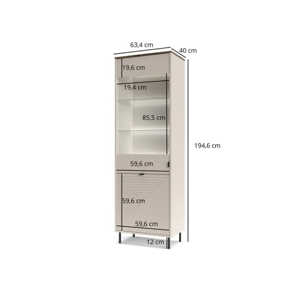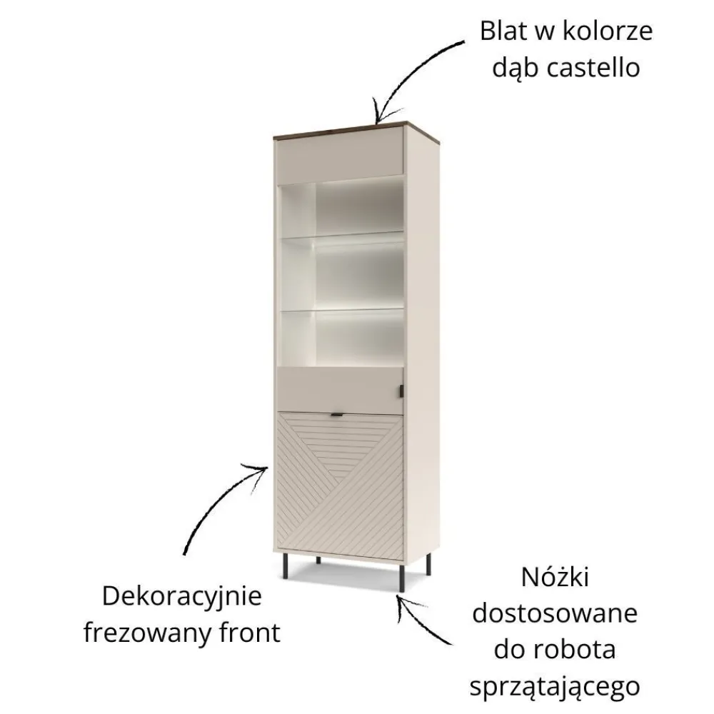 Wysoka witryna EVO 1D1W EO-09 to połączenie nowoczesnego designu z eleganckim wykończeniem, które doda Twojemu salonowi wyjątkowego charakteru. Szklane fronty i półki witryny tworzą efekt lekkości, jednocześnie eksponując przedmioty, które chcesz wyeksponować, takie jak porcelana, szkło czy dekoracje. Kolor korpusu w odcieniu kaszmiru harmonizuje z wnętrzem witryny, nadając jej ciepły i przytulny wygląd. Witryna przyciąga wzrok i stanowi doskonałe tło dla Twojej kolekcji, podkreślając jej wyjątkowość. To mebel, który doskonale wpasuje się w różnorodne aranżacje, od nowoczesnych po klasyczne, nadając wnętrzu elegancji i wyrafinowania. Witryna EVO 1D1W EO-09 nie tylko podnosi estetykę salonu, ale również tworzy przestrzeń do efektownego wyeksponowania Twoich ulubionych przedmiotów.