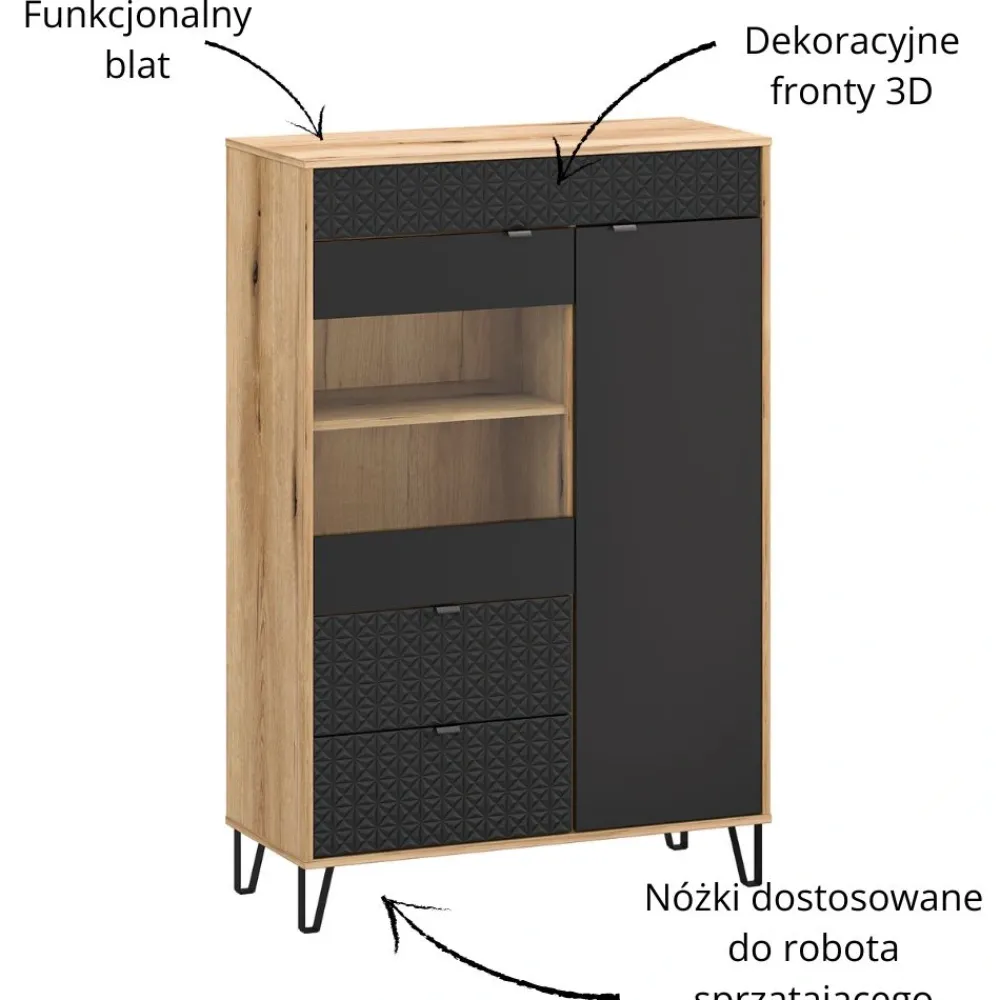 Dolna część witryny została wyposażona w dwie funkcjonalne szuflady, które zwiększają możliwości przechowywania. To idealne miejsce na drobne akcesoria, dokumenty lub elementy, które chcesz mieć pod ręką, ale poza zasięgiem wzroku. Szuflady pomagają zachować porządek i lepszą organizację przestrzeni. Ich obecność sprawia, że witryna jest meblem uniwersalnym i wielozadaniowym. To rozwiązanie, które łączy estetykę z codzienną wygodą użytkowania. Idealne do nowoczesnych wnętrz.