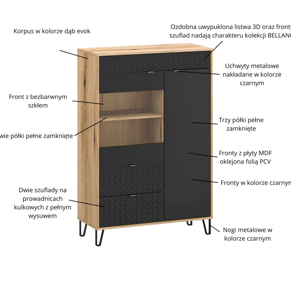Witryna Bellano została osadzona na metalowych nogach o wysokości 12 cm, które nadają bryle nowoczesnej lekkości. Podwyższona konstrukcja ułatwia utrzymanie czystości oraz umożliwia swobodną pracę robota sprzątającego. Metalowe nogi zapewniają stabilność i trwałość całej konstrukcji. Czarne wykończenie idealnie współgra z detalami frontów i kolorystyką dąb evok z czernią. Fronty wykonane z płyty MDF oklejonej folią PCV oraz korpus z laminowanej płyty meblowej gwarantują długą żywotność mebla. To solidna i stylowa witryna, która doskonale uzupełni kolekcję Bellano.