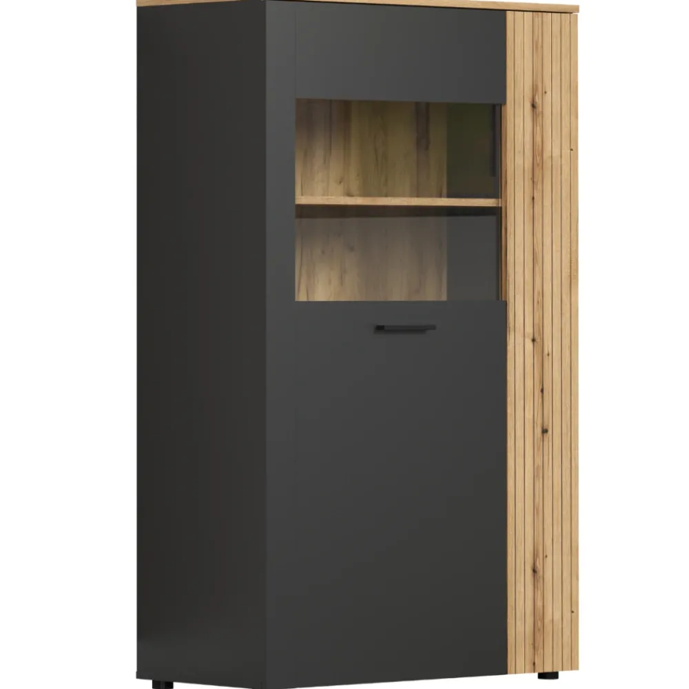 Niska witryna 146 cm grafit/dąb evok Estebabn – stylowy mebel, który powinieneś mieć w swoim salonie