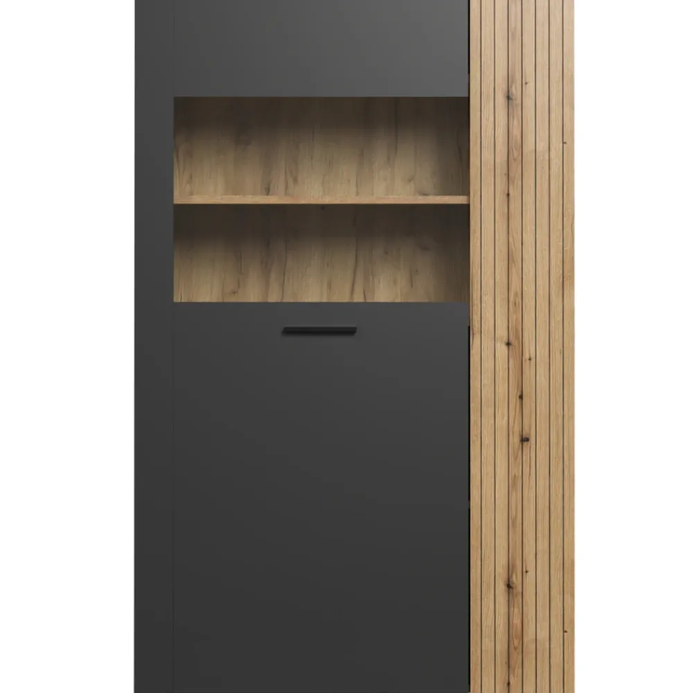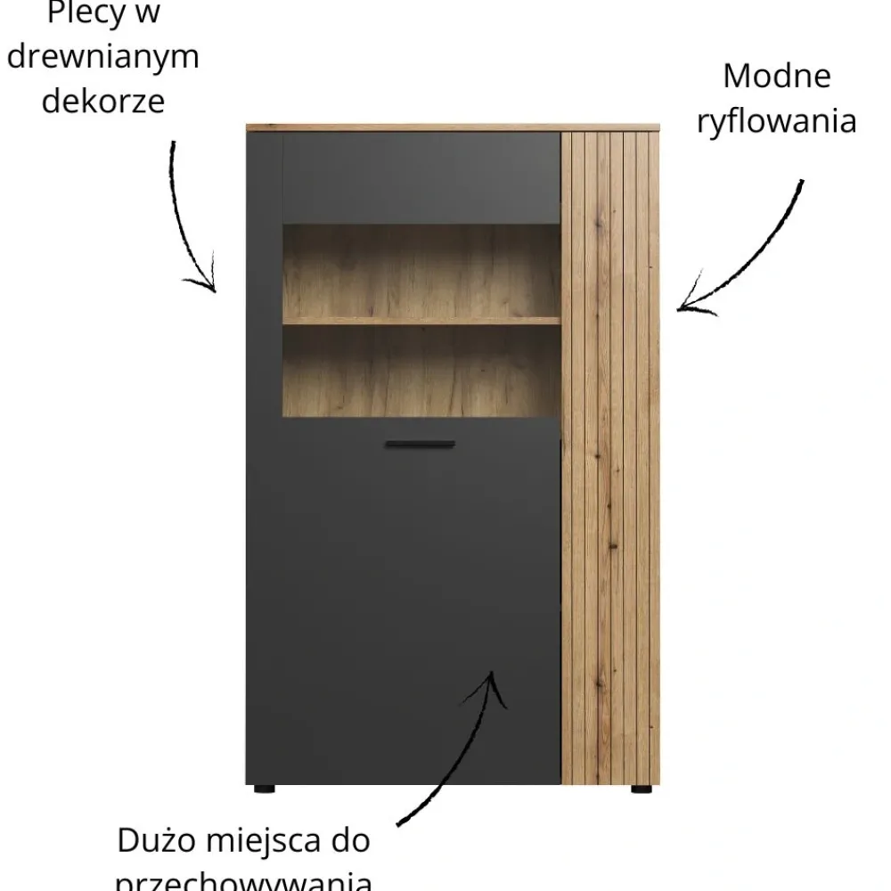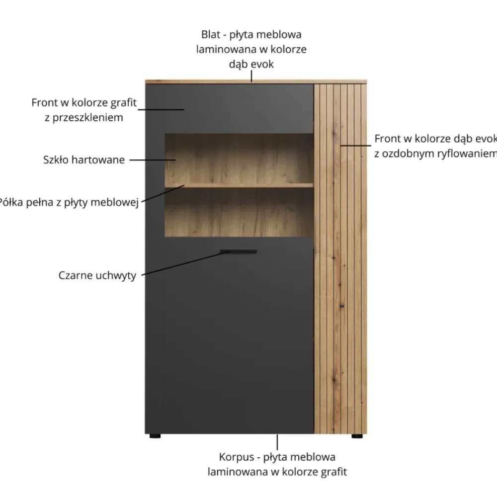 Drzwi witryny wyposażone są w szkło hartowane, które znacząco zwiększa bezpieczeństwo użytkowania oraz trwałość konstrukcji. Dzięki szkleniu możesz wyeksponować ulubione dekoracje, zastawę, książki lub pamiątki, tworząc atrakcyjną wizualnie ekspozycję. Hartowane szkło jest znacznie bardziej odporne na uszkodzenia niż zwykłe, co sprawia, że mebel doskonale nadaje się również do domów z dziećmi. Transparentna część frontu pięknie komponuje się z grafitową ramą i dębowymi akcentami, nadając witrynie nowoczesnego, eleganckiego charakteru. Przeszklenie dodaje lekkości bryle, co optycznie powiększa pomieszczenie. To rozwiązanie, dzięki któremu Twoje dekoracje będą wyglądać wyjątkowo efektownie.