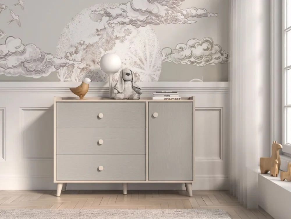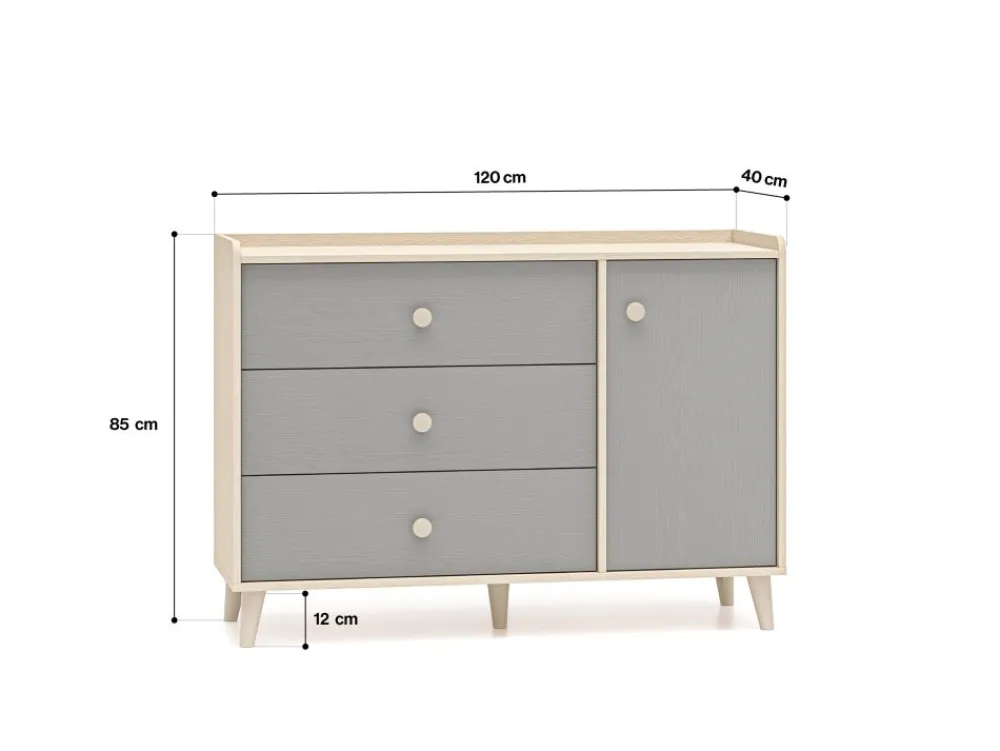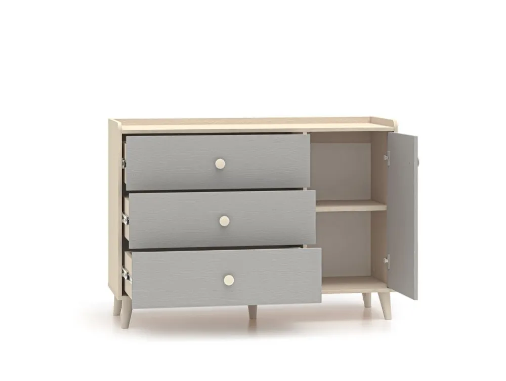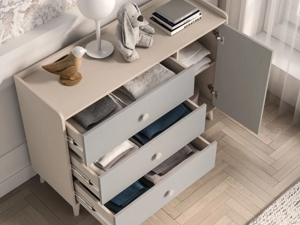Komoda Mevel 05 to mebel, który zapewni odpowiednią ilość miejsca do przechowywania oraz pozwoli wyeksponować ulubione przedmioty. Bryła podzielona jest na dwie strefy. Lewą stronę mebla tworzą trzy pojemne szuflady. Idealne na bieliznę, skarpetki czy pościel. Prawa strona bryły to dwie duże, zamykane wnęki. Umieścisz w nich ubrania lub zabawki. Szeroki blat to odpowiednie miejsce do ułożenia czytanych książek czy ustawienia ulubionych zabawek. Dzięki obniżonemu wieńcowi górnemu oraz dodatkowej tylnej listwie przedmioty należące do Twojego dziecka będą zabezpieczone przed upadkiem. Już żadna zabawka nie spadnie za mebel. • Współczesny design. • Zaokrąglone rogi. • Wysoka funkcjonalność. • Duże, ergonomiczne uchwyty. • Nóżki o odpowiedniej wysokości. • System cichego domykania. • Szuflady z funkcją pełnego wysuwu oraz wzmocnionym dnem.