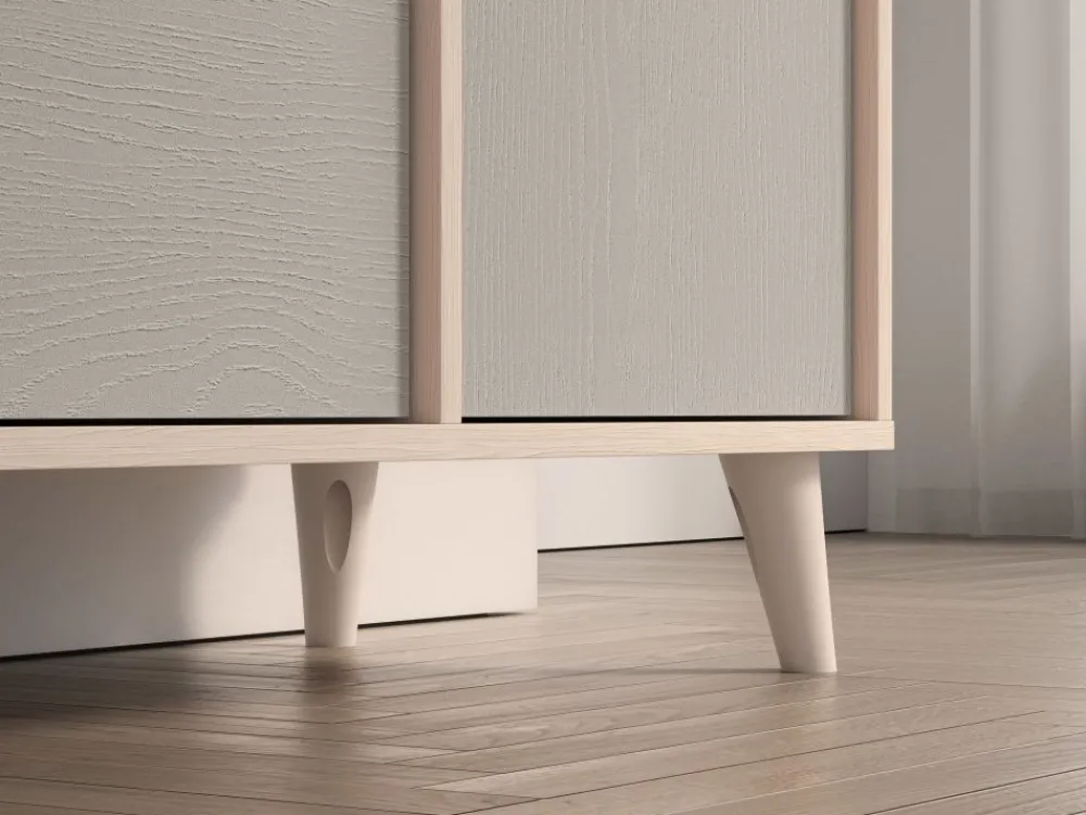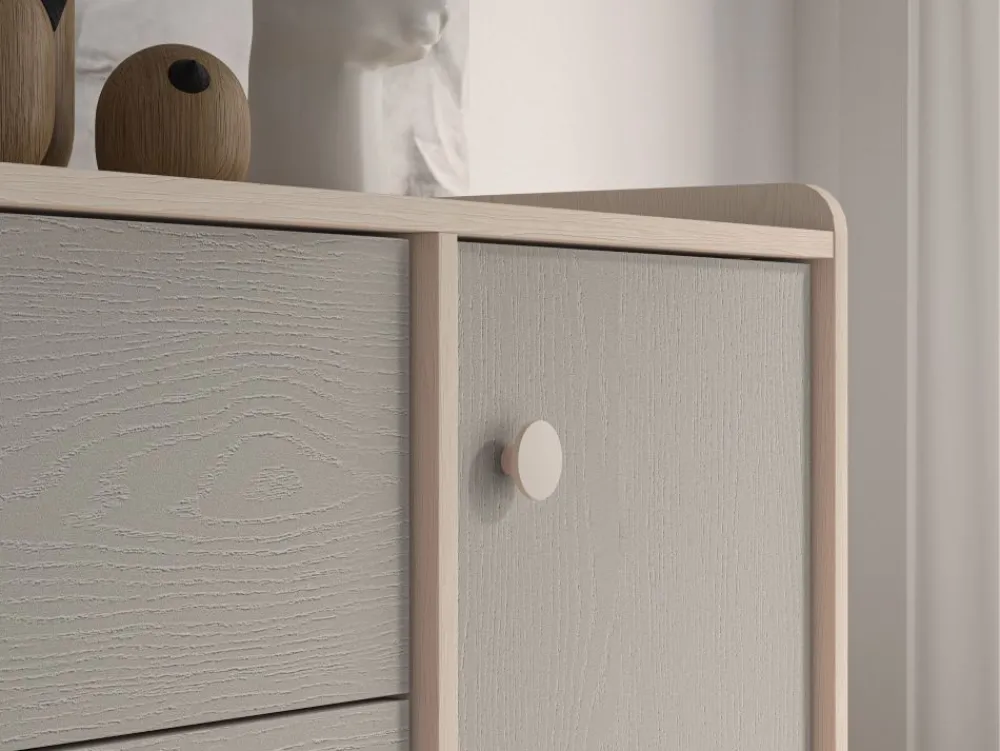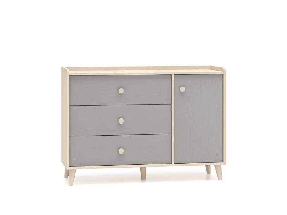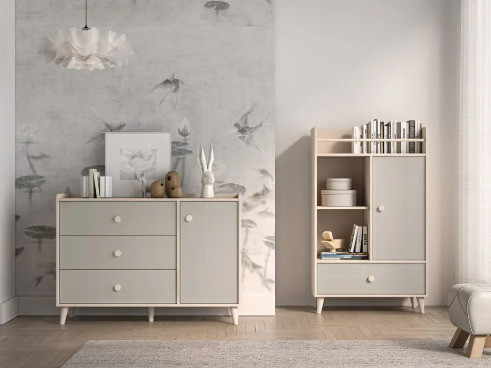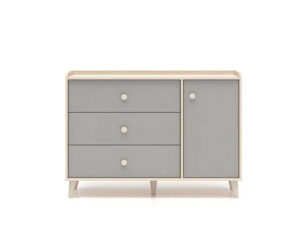 Komoda Mevel 05 to mebel, który zapewni odpowiednią ilość miejsca do przechowywania oraz pozwoli wyeksponować ulubione przedmioty. Bryła podzielona jest na dwie strefy. Lewą stronę mebla tworzą trzy pojemne szuflady. Idealne na bieliznę, skarpetki czy pościel. Prawa strona bryły to dwie duże, zamykane wnęki. Umieścisz w nich ubrania lub zabawki. Szeroki blat to odpowiednie miejsce do ułożenia czytanych książek czy ustawienia ulubionych zabawek. Dzięki obniżonemu wieńcowi górnemu oraz dodatkowej tylnej listwie przedmioty należące do Twojego dziecka będą zabezpieczone przed upadkiem. Już żadna zabawka nie spadnie za mebel. • Współczesny design. • Zaokrąglone rogi. • Wysoka funkcjonalność. • Duże, ergonomiczne uchwyty. • Nóżki o odpowiedniej wysokości. • System cichego domykania. • Szuflady z funkcją pełnego wysuwu oraz wzmocnionym dnem.