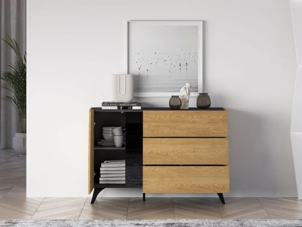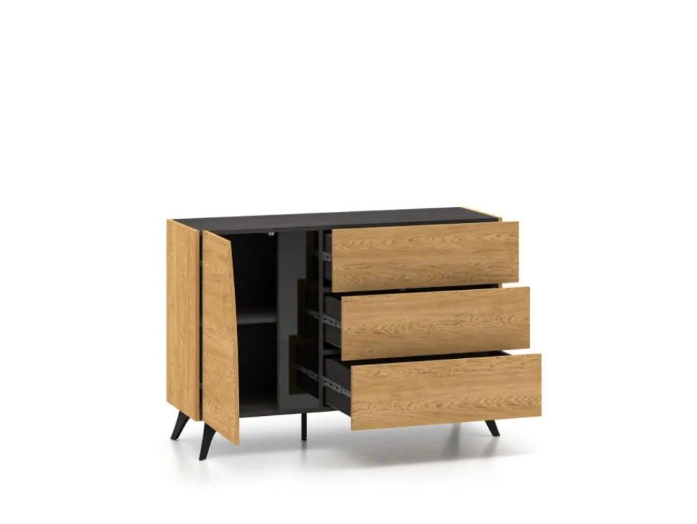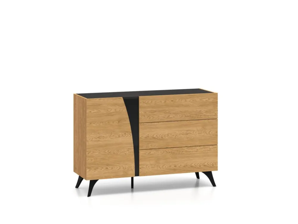 Komoda Toscania 05 to idealny mebel do przechowywania. Za drzwiczkami znajduje się półka dzieląca przestrzeń na dwie pojemne wnęki. Przechowasz w nich ubrania, ręczniki czy pościel. Prawą stronę mebla tworzą trzy głębokie szuflady, które zapewnią odpowiednią ilość miejsca na dokumenty, obrusy lub inne domowe tekstylia. Komoda będzie świetnym dopełnieniem Twojego salonu lub sypialni. Szeroki blat będzie idealnym miejscem do wyeksponowania eleganckich wazonów, pamiątek z podróży lub innych ulubionych gadżetów. Komoda Toscania 05 łączy ze sobą wysoką funkcjonalność ze współczesnym designem. Bezuchwytowe fronty dodatkowo podkreślają nowoczesną stylistykę mebla, który spełni Twoje oczekiwania. • Funkcjonalny mebel w pięknym wydaniu. • Wygodne otwieranie drzwiczek z funkcją push to open. • Szuflady ze wzmocnionym dnem oraz funkcją pełnego wysuwu. • Specjalnie wyprofilowane, metalowe nóżki.