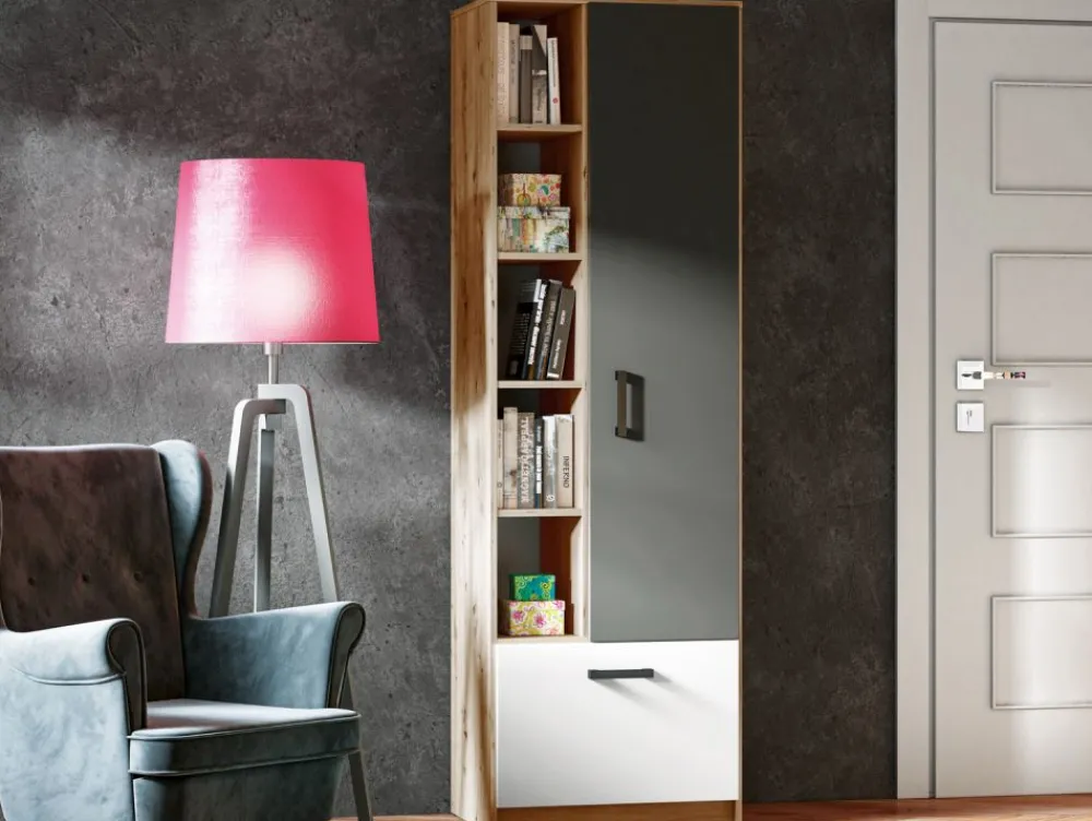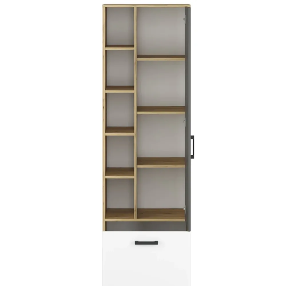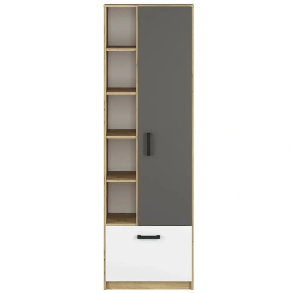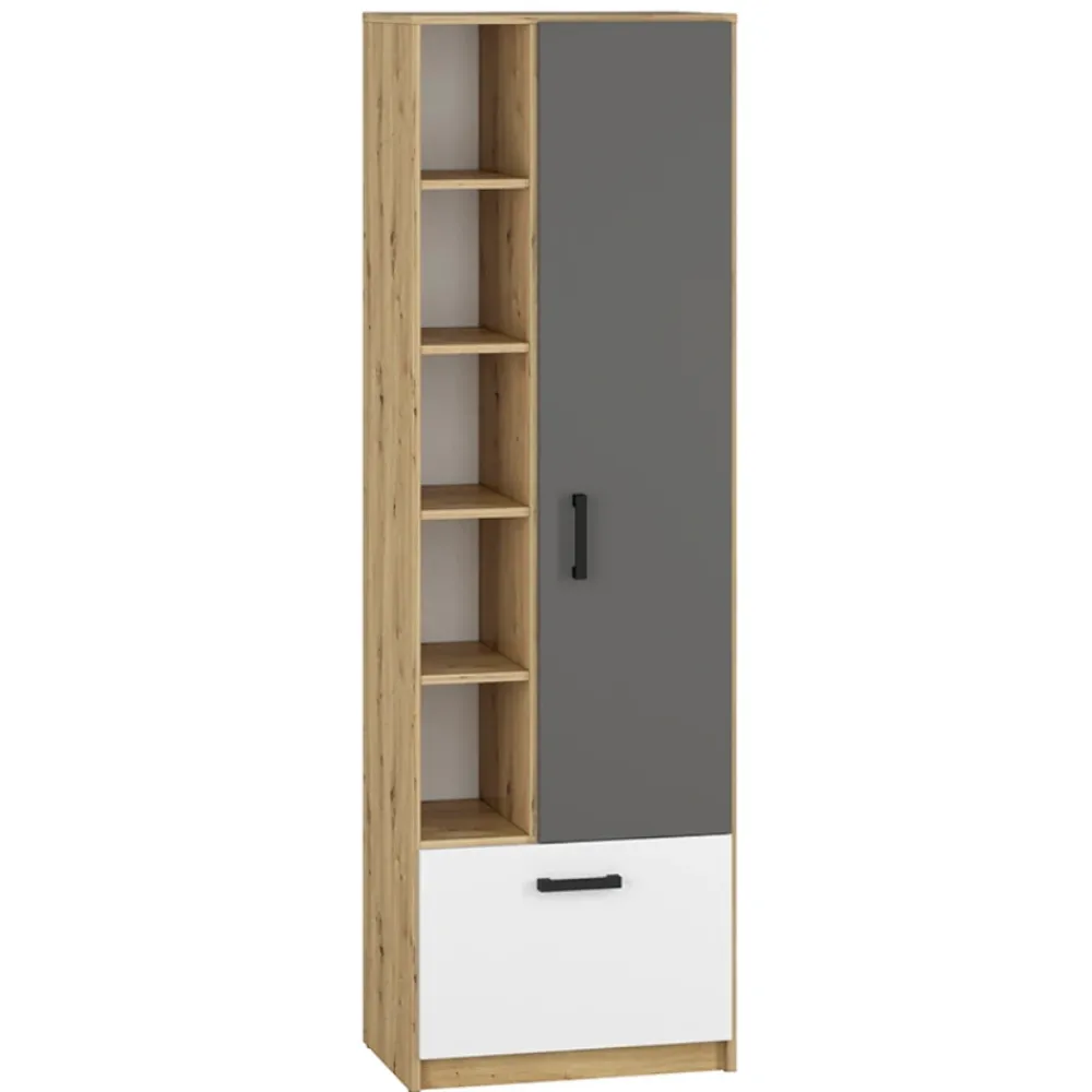 Model FINI 03 wyposażono w 5 wąskich, otwartych półek, które doskonale sprawdzą się do eksponowania książek, dekoracji lub akcesoriów hobbystycznych. Dodatkowo regał posiada 4 szerokie półki zamknięte w szafce, umożliwiające estetyczne przechowywanie rzeczy wymagających uporządkowania. Poniżej półek znajduje się przestronna, głęboka szuflada, idealna na drobiazgi, zeszyty czy akcesoria szkolne. Taki układ pozwala zachować równowagę pomiędzy ekspozycją a dyskretnym przechowywaniem. Wszystko ma swoje miejsce i jest zawsze łatwo dostępne.
