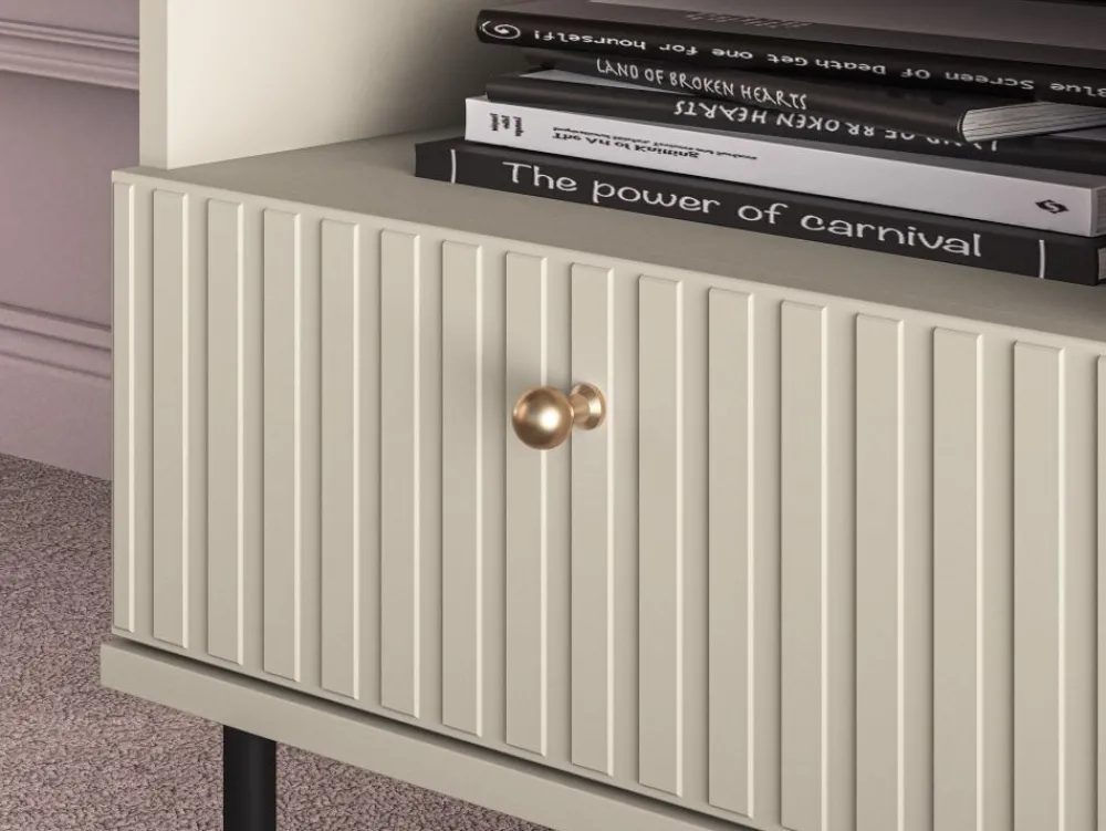 Otwarte wnętrze szafki to idealne miejsce na książki, magazyny czy notes. Pojemna szuflada z systemem pełnego wysuwu pozwala przechować drobne akcesoria, które chcesz mieć blisko, ale poza zasięgiem wzroku. To doskonałe połączenie porządku i wygody.