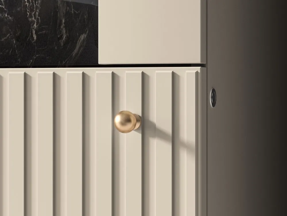 Kolekcja Sophie to połączenie współczesnej elegancji z funkcjonalnością. Dekor w kolorze kaszmiru, stylowe frezowania, smukłe czarne nóżki oraz gałki w odcieniu szczotkowanego złota tworzą harmonijną i przyciągającą wzrok całość. Witryna Sophie 02 doskonale odnajdzie się zarówno w klasycznych, jak i nowoczesnych wnętrzach.