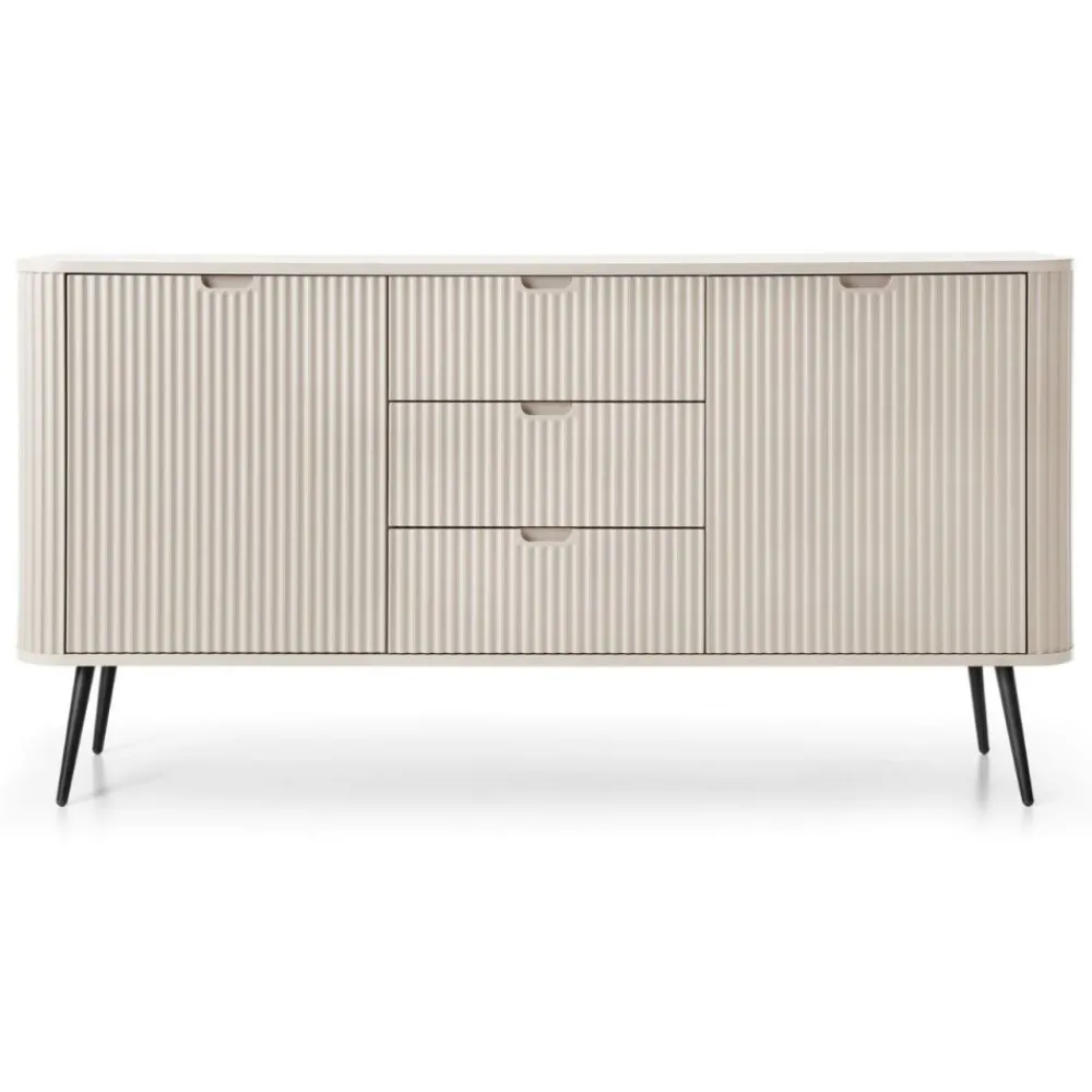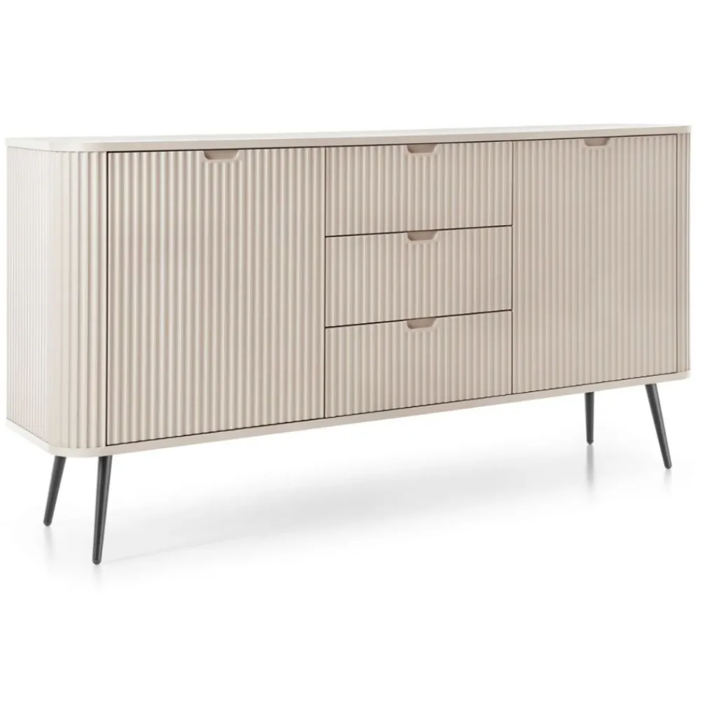 Komoda Zova to kwintesencja elegancji i nowoczesności. Jej harmonijna forma oraz nowoczesny design z pewnością przyciągną wzrok każdego gościa. Delikatnie zaokrąglone krawędzie nadają jej subtelności, a fronty zdobione ryflowanym wzorem wprowadzają niepowtarzalny charakter i głębię wizualną, która ożywi każde wnętrze.