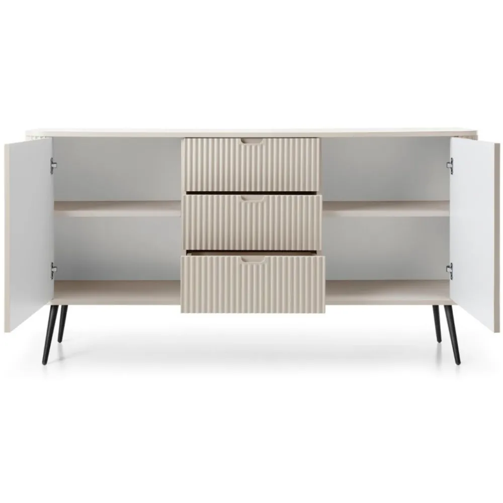 Komoda Zova to nie tylko piękny, ale także niezwykle praktyczny mebel. Wyposażona w drzwi z żłobionymi uchwytami, które są zarówno funkcjonalne, jak i estetyczne. Wnętrze komody kryje dwie przestronne szafki z półkami oraz trzy szuflady, które idealnie nadają się do przechowywania niezbędnych przedmiotów, akcesoriów i dokumentów.