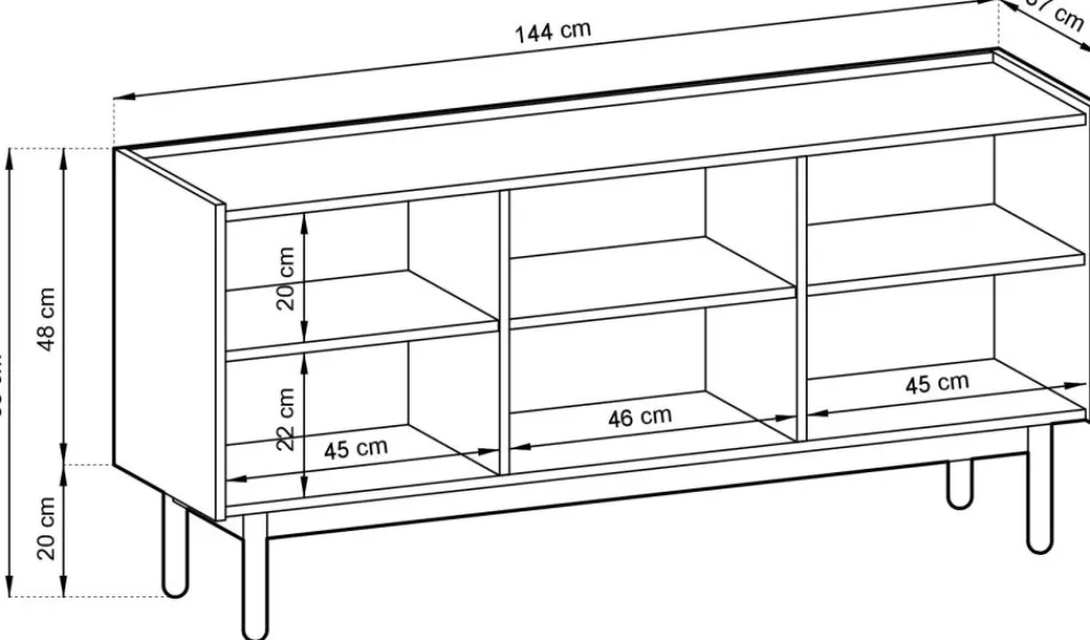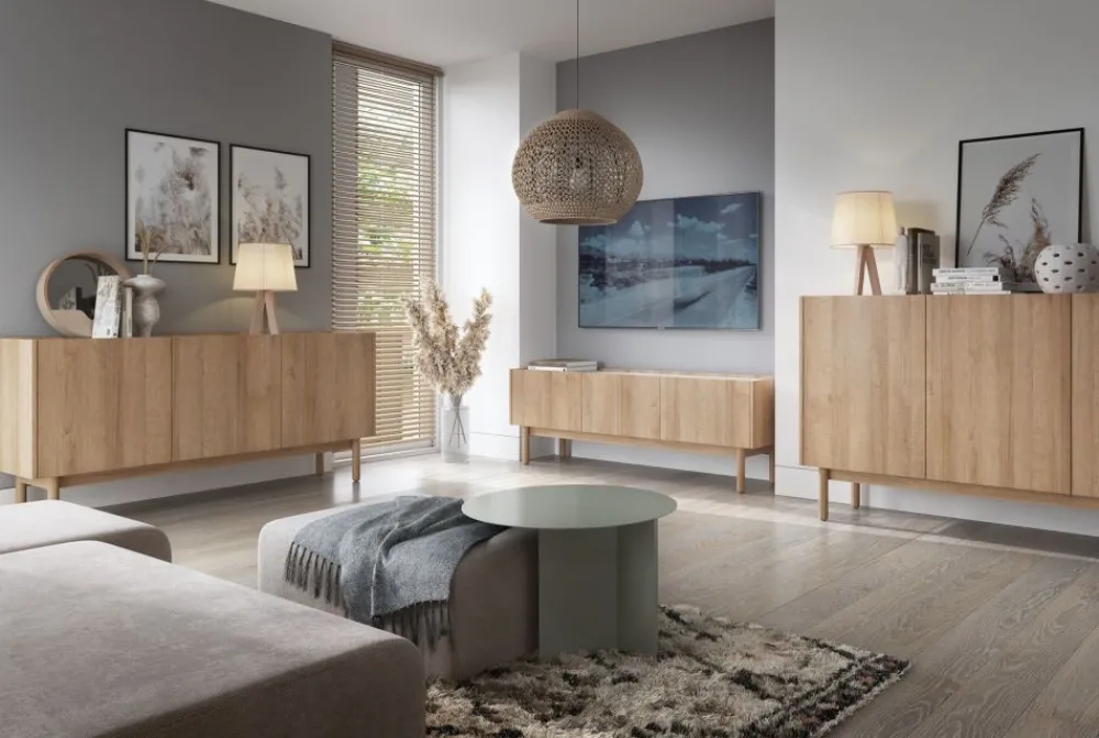 Komoda w stylu boho ma wysokie nogi wykonane z litego drewna, co gwarantuje stabilność i ułatwia sprzątanie przestrzeni pod meblem. Jasny kolor frontów w połączeniu z wykończeniem w kolorze dąb riviera złoty tworzy harmonijną i stylową całość.