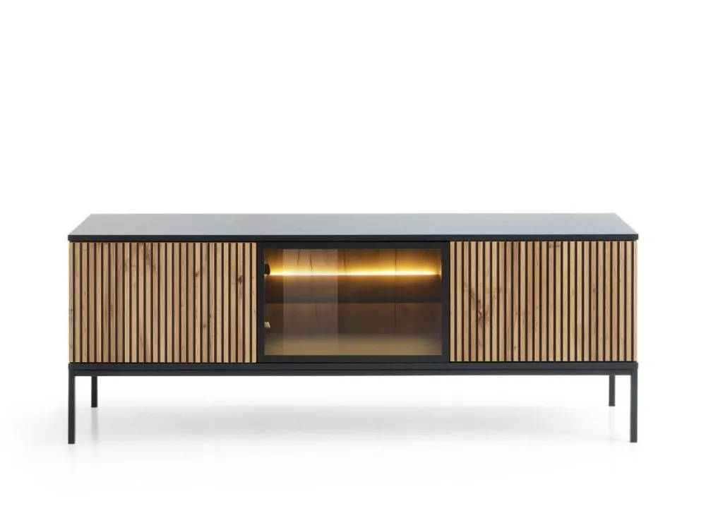 Nasza szafka RTV to połączenie elegancji i nowoczesnego designu, idealne do przechowywania sprzętu multimedialnego i dodatków w Twoim salonie. Jej frezowany i przeszklony front dodaje wnętrzu ciepła i naturalnego uroku, jednocześnie zachowując nowoczesny charakter.