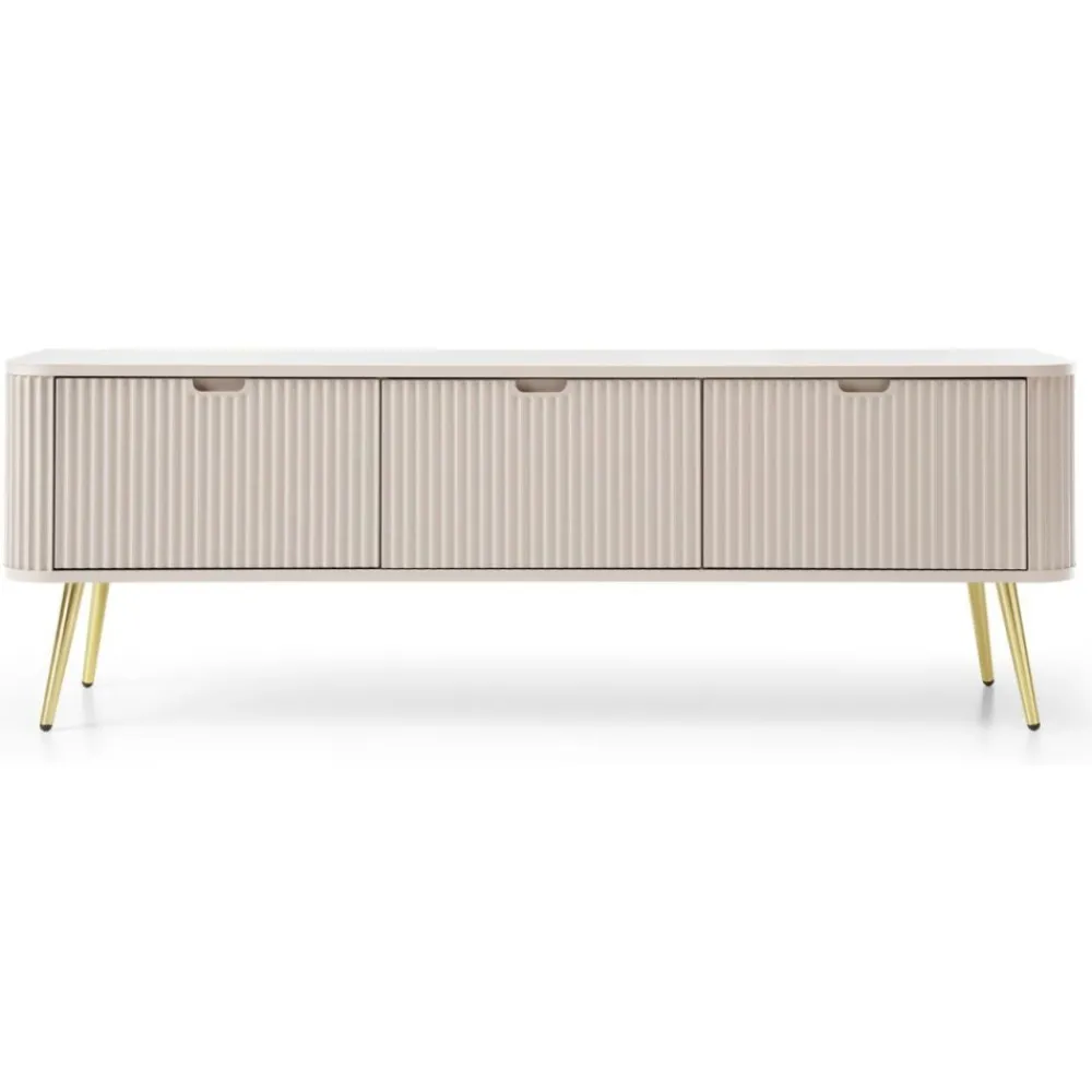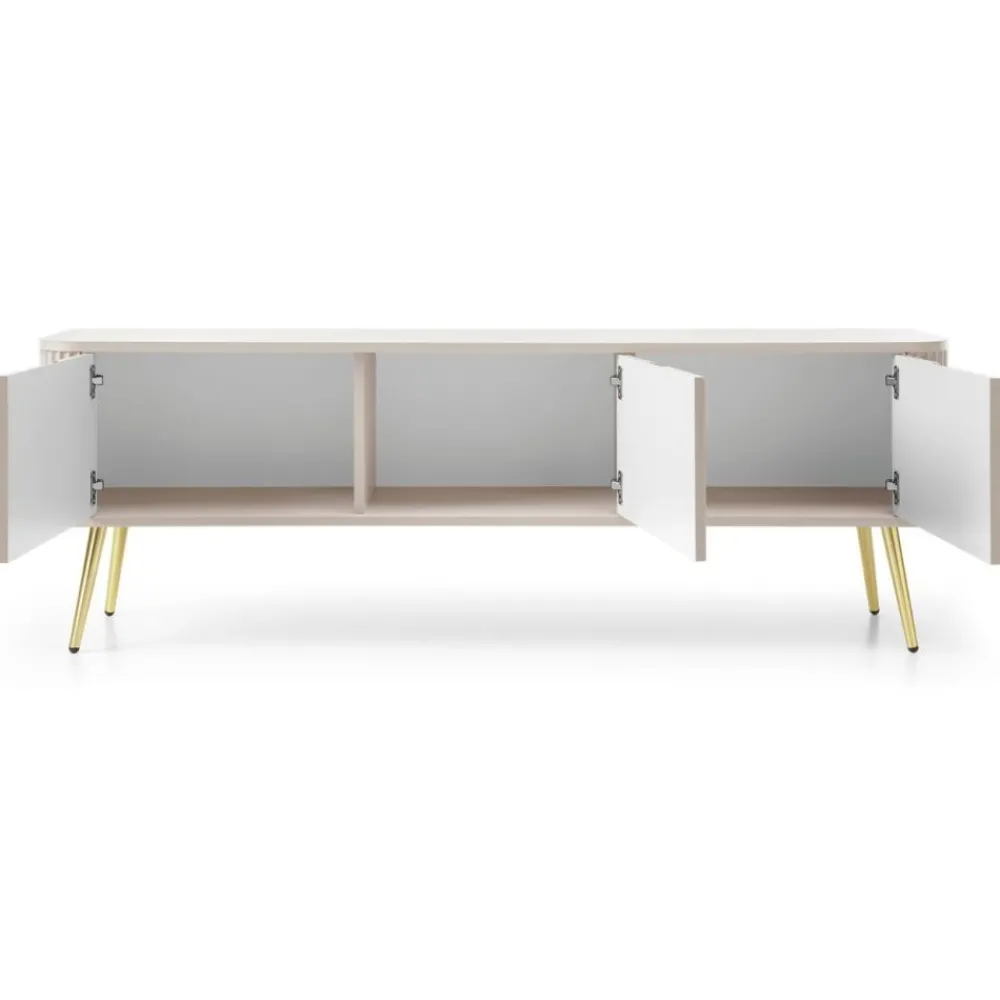 Metalowe nóżki w kolorze złota gwarantują stabilność konstrukcji, jednocześnie dodając jej luksusowego i eleganckiego wyglądu. Szafka RTV wyposażona jest w drzwi z żłobionymi uchwytami, które ułatwiają otwieranie i nadają jej wyjątkowy, elegancki charakter. Wnętrze szafki składa się z trzech praktycznych wnęk, idealnych do przechowywania akcesoriów, dokumentów i innych niezbędnych przedmiotów. Komoda Zova wyróżnia się swoim designerskim wyglądem, stanowiąc wyjątkowy dodatek do każdego wnętrza i wzbogacając je unikalnym stylem oraz elegancją.