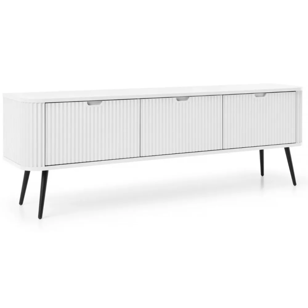 Szeroka szafka RTV Zova to wyjątkowy mebel, który łączy nowoczesny design z funkcjonalnością. Jej prosta, a zarazem elegancka forma doskonale komponuje się z nowoczesnymi wnętrzami, nadając im wyrafinowanego charakteru. Subtelnie zaokrąglone krawędzie nadają szafce delikatności, podczas gdy fronty z ryflowanym wzorem dodają jej niepowtarzalnego uroku i głębi. Szafka wykonana jest z wysokiej jakości płyty laminowanej oraz płyty MDF, co gwarantuje jej solidność i odporność na codzienne użytkowanie, a jednocześnie sprawia, że mebel zachowuje swój atrakcyjny wygląd na lata.