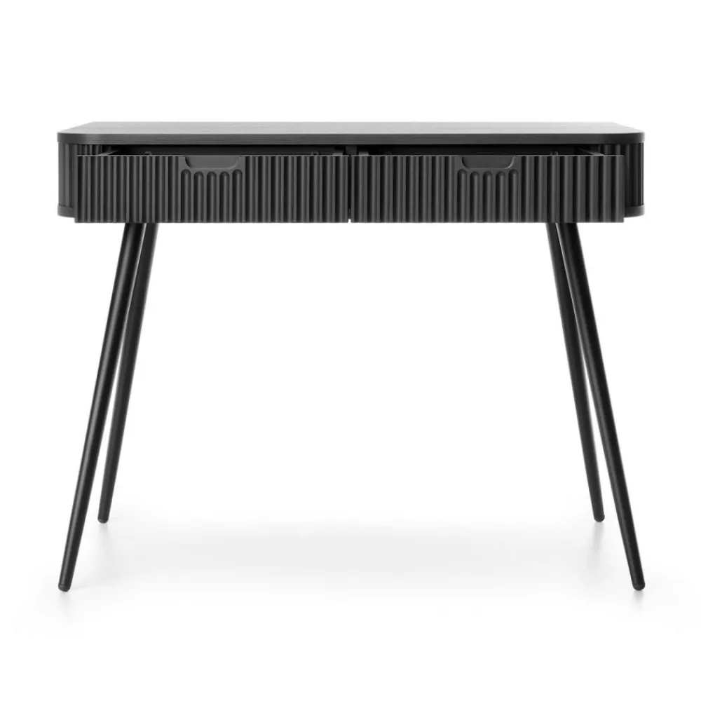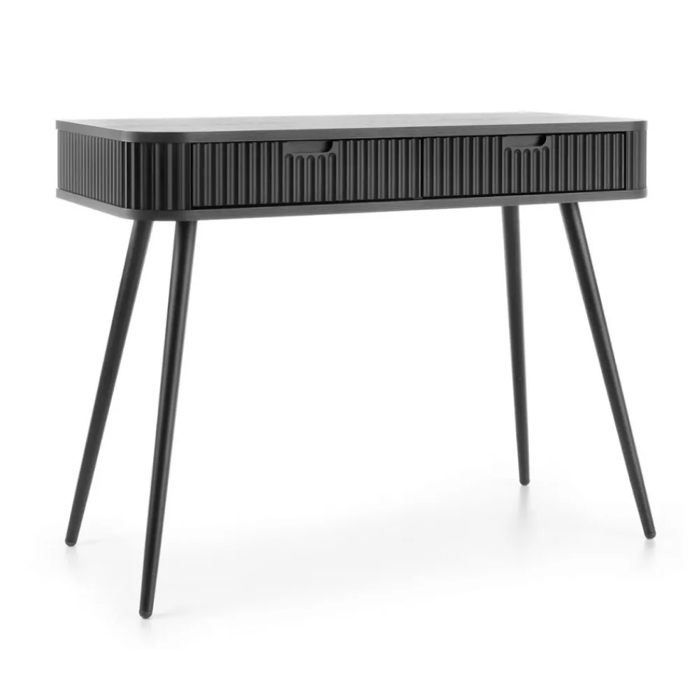 Toaletka Zova jest wykonana z wysokiej jakości płyty laminowanej oraz MDF, co gwarantuje trwałość i odporność na codzienne użytkowanie, zachowując przy tym estetyczny wygląd przez wiele lat. Czarne metalowe nóżki zapewniają stabilność konstrukcji, dodając jednocześnie luksusowego akcentu, który podkreśla elegancję mebla.