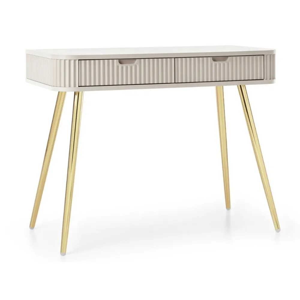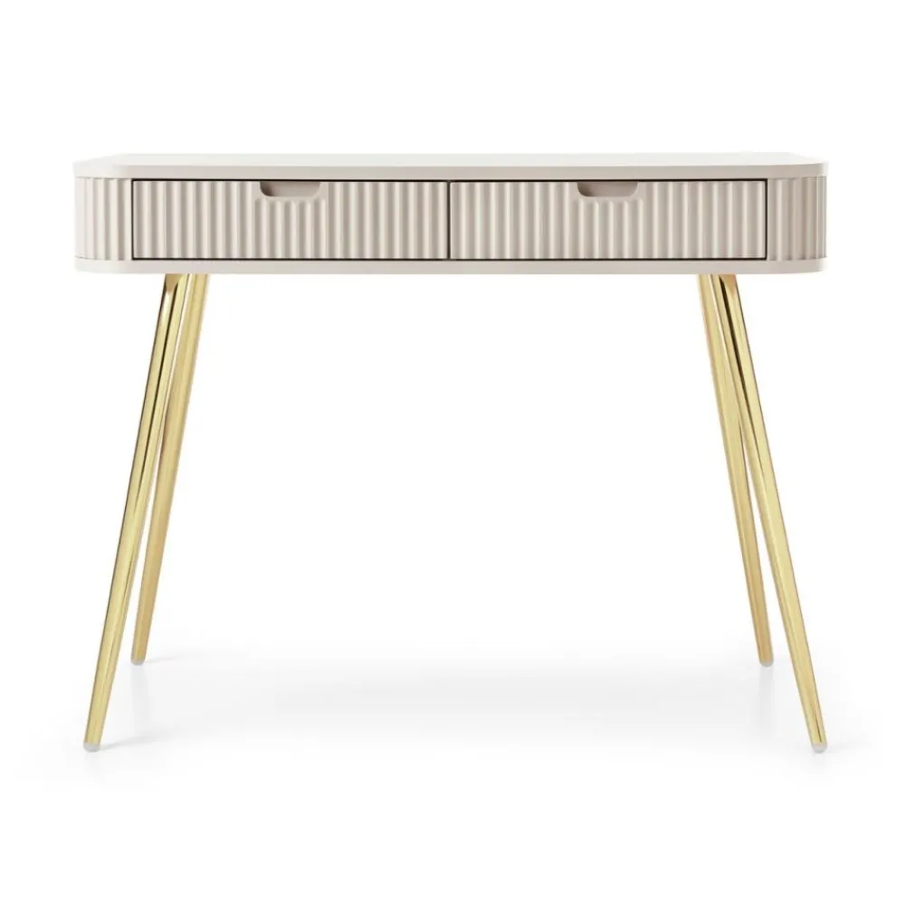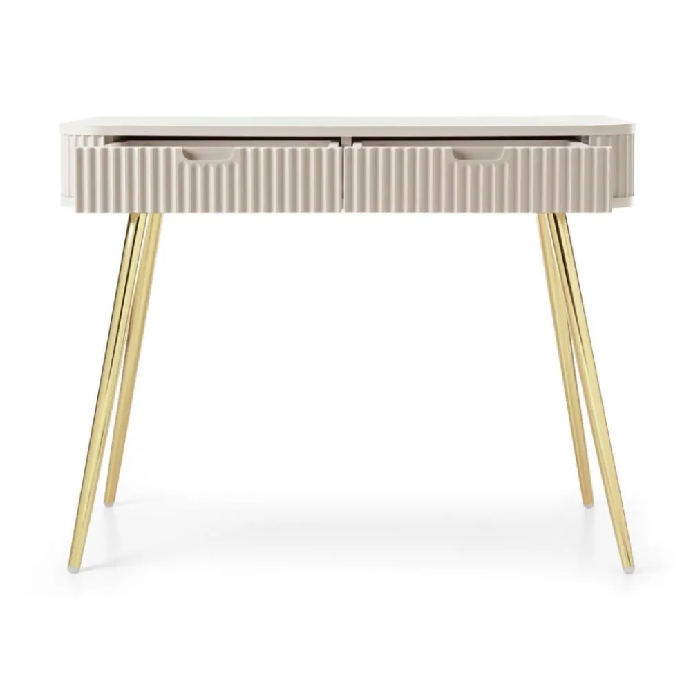 Toaletka wyposażona jest w praktyczne szuflady z subtelnymi, żłobionymi uchwytami, które ułatwiają ich otwieranie i nadają całości eleganckiego wyglądu. Wnętrze toaletki składa się z dwóch przestronnych szuflad, idealnych do przechowywania kosmetyków, biżuterii i innych niezbędnych drobiazgów. Toaletka Zova to wyjątkowy mebel, który stanie się ozdobą każdego wnętrza, wnosząc do niego niepowtarzalny styl i elegancję.