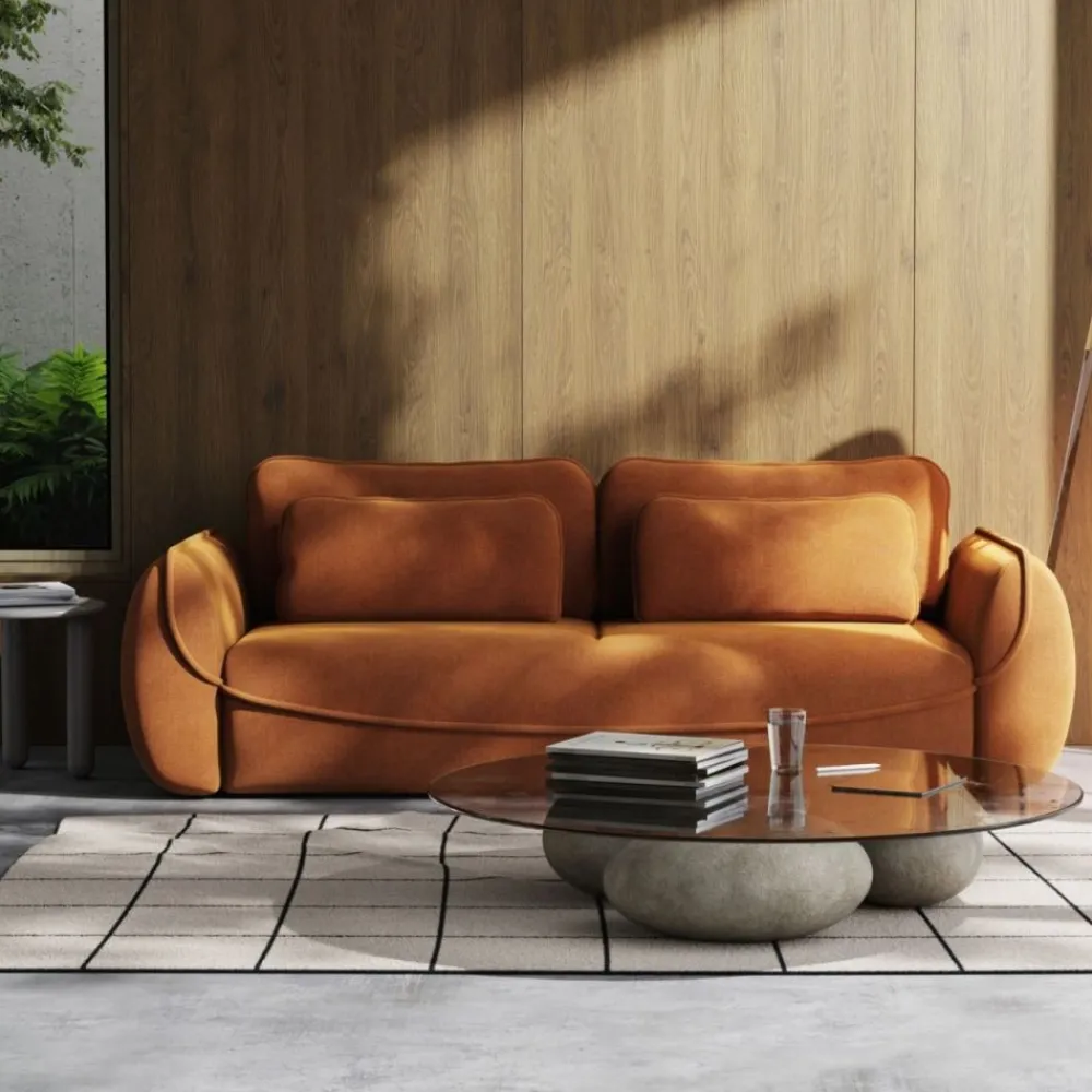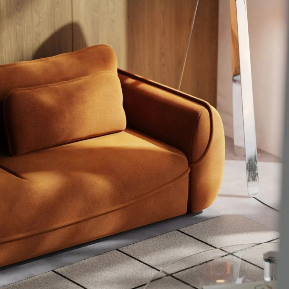 Wyjątkowy kształt kanapy Umea z zaokrąglonymi bokami i starannie wykończonymi detalami przyciąga wzrok i podkreśla charakter wnętrza. Ten model idealnie sprawdzi się zarówno w aranżacjach nowoczesnych, jak i w modnych przestrzeniach japandi czy industrialnych. Cynamonowa tkanina dodaje wnętrzu przytulności i naturalnego uroku.