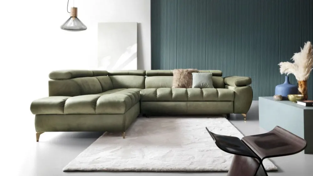 Cechą charakterystyczną narożnika Lugano jest przepikowane siedzisko, które wygląda niezwykle elegancko i szykownie. Pochylony podłokietnik i wysokie nóżki dodają lekkości całej bryle mebla. Narożnik odnajdzie się w stylu nowoczesnym, a także glamour. Niesamowite jest to, że ten zgrabny mebel kryje funkcję spania oraz pojemnik na pościel. Regulowane zagłówki oraz podłokietnik umożliwiają dopasowanie do wygodnej pozycji przy odpoczynku.