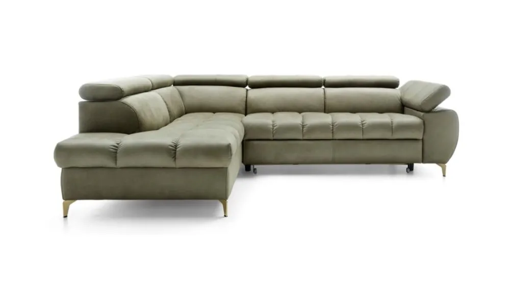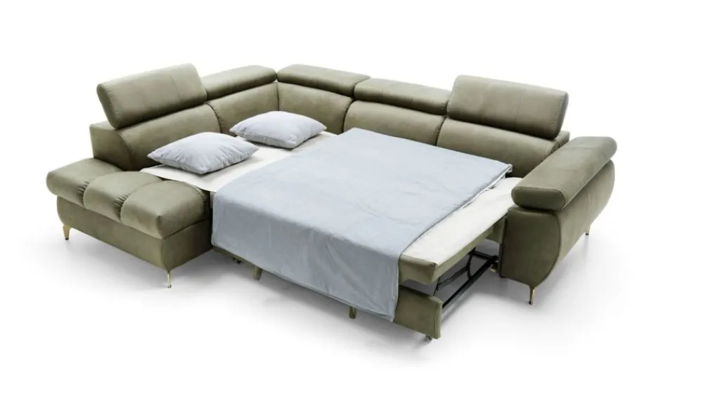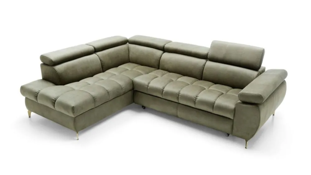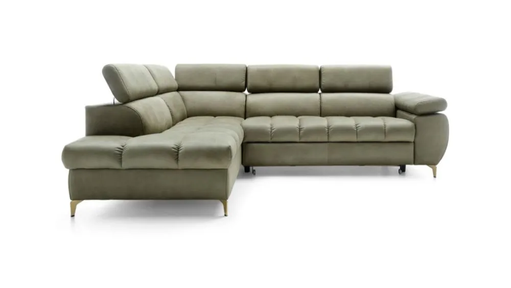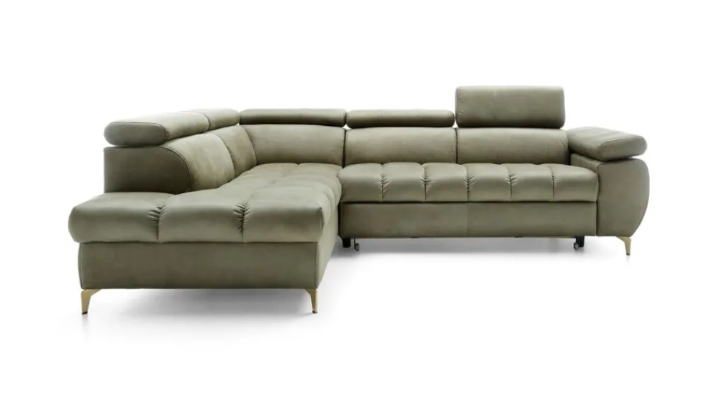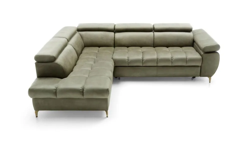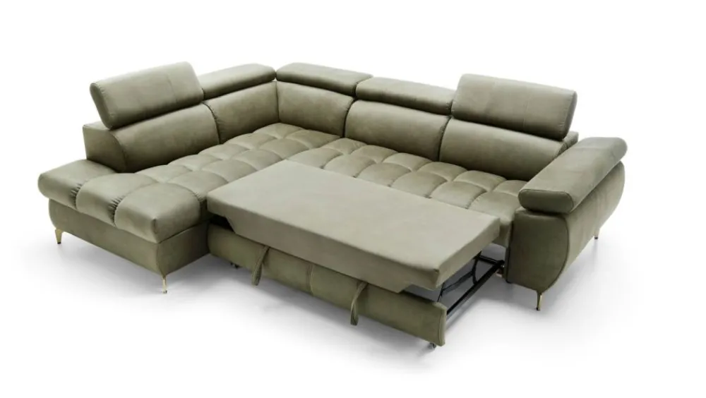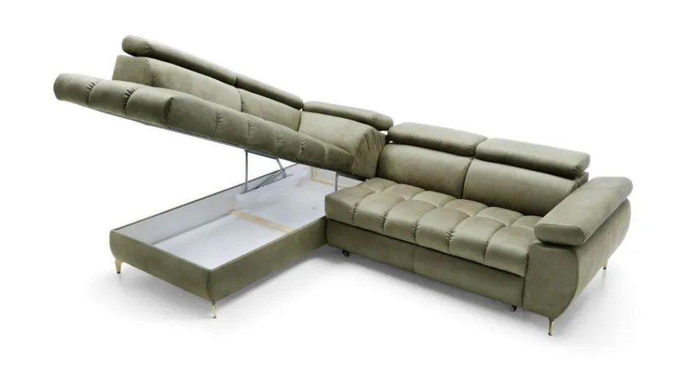 Narożnik w wypełnieniu siedziska posiada sprężyny faliste. Narożnik wyposażony jest w funkcję spania oraz pojemnik na pościel. Dodatkowym atutem są regulowane zagłówki (77-93 cm), które zwiększają komfort siedzenia poprzez zwiększenie wysokości oparcia.