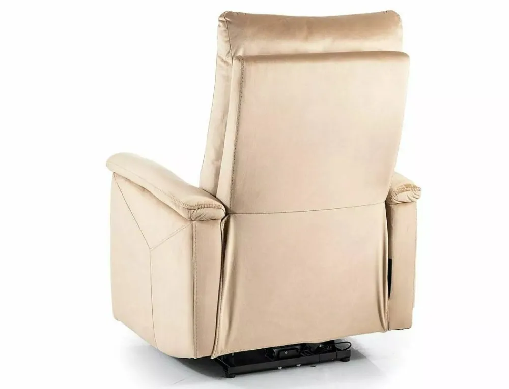 Fotel rozkładany elektrycznie z funkcją masażu, tkanina aksamit: Bluvel, kolory: beżowy 28. Sterowanie rozkładaniem za pomocą panelu na prawym boku fotela. Panel wyposażony dodatkowo w podświetlany port USB. Funkcje masażu regulowane za pomocą przewodowego pilota, w opcji: czas pracy, wybór strefy i intensywności masażu, podgrzewanie odcinka lędźwiowego. Bok fotela posiada praktyczną kieszeń.