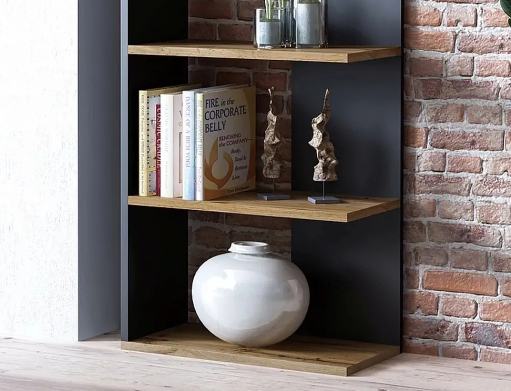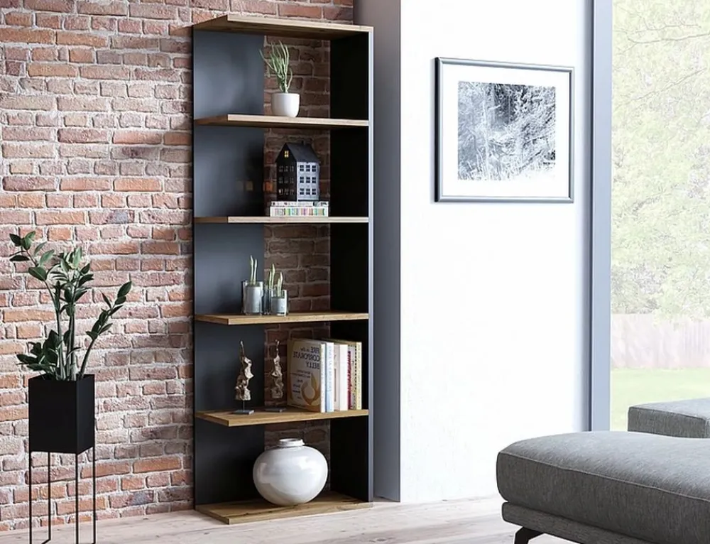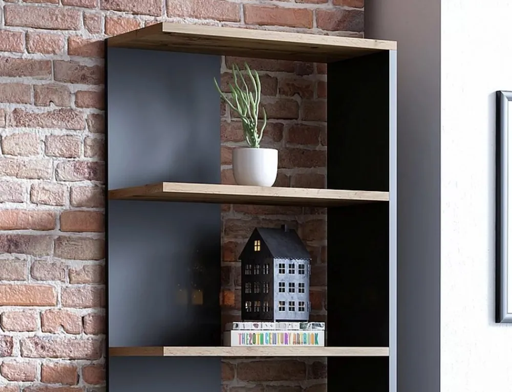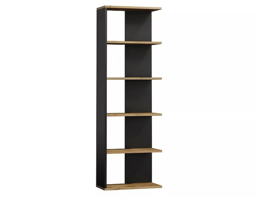Regał, płyta laminowana, kolor: dąb wotan + czarny. Uniwersalny: lewo- lub prawostronny. Odległość między półkami: 318mm.