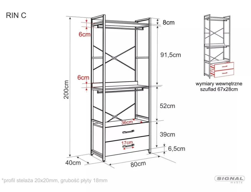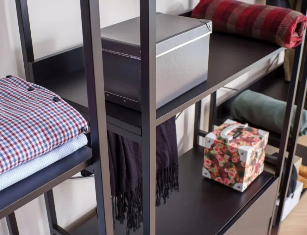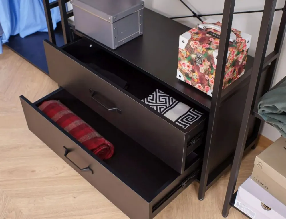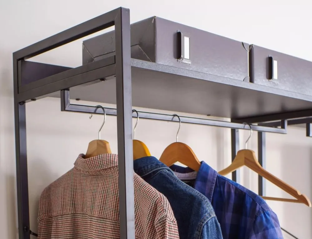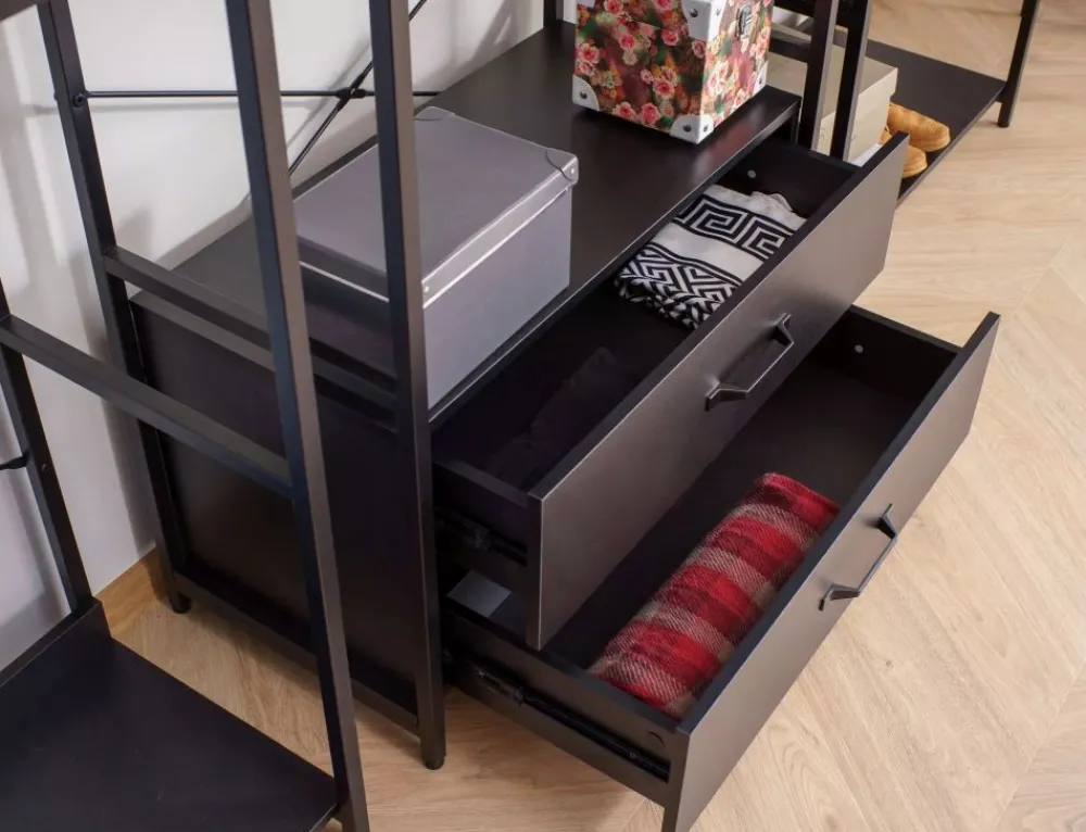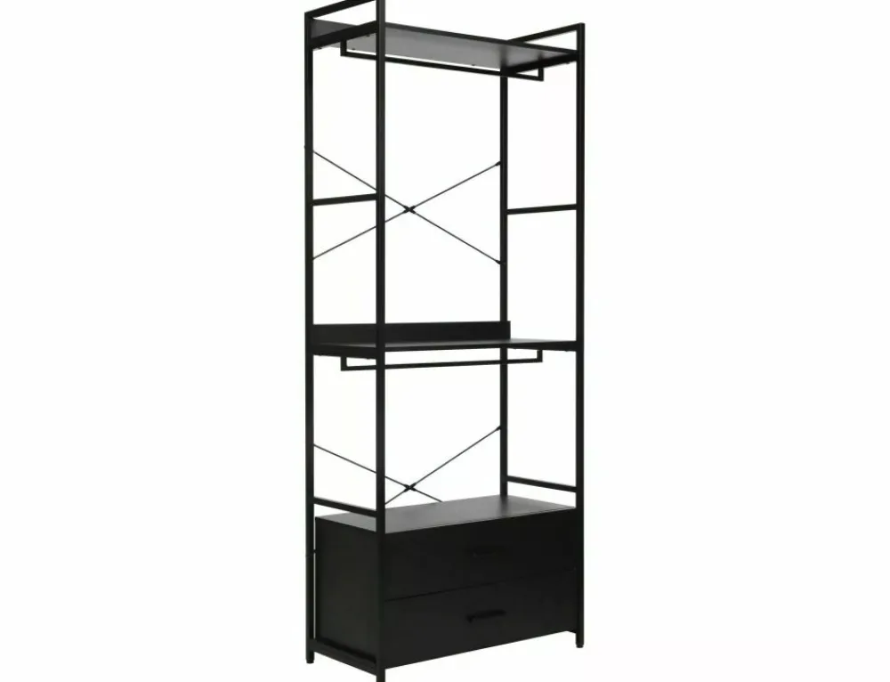 Regał / wieszak, półki: płyta laminowana, stelaż: metal, kolor: czarny / czarny mat. Zamykana szafka z półką.
