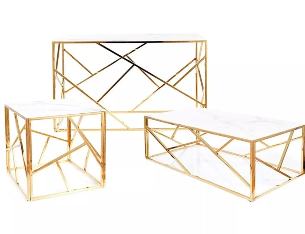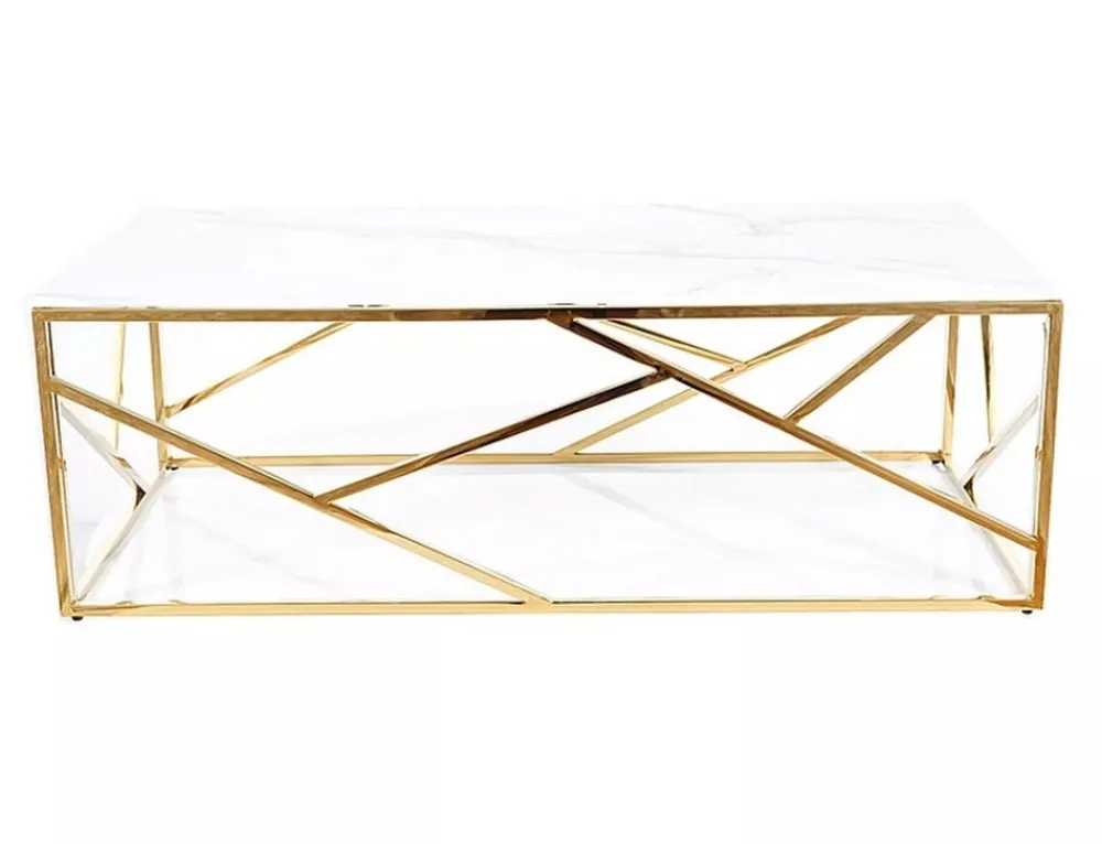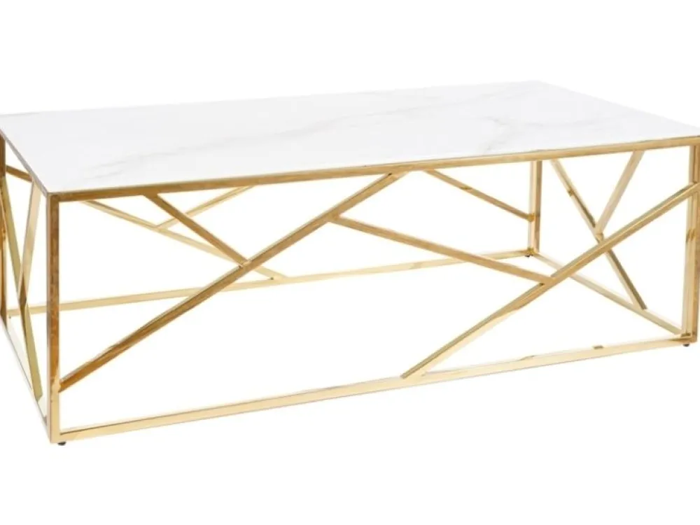 Ława, blat: szkło hartowane, stelaż: stal nierdzewna, kolor: biały, efekt marmuru / złoty.