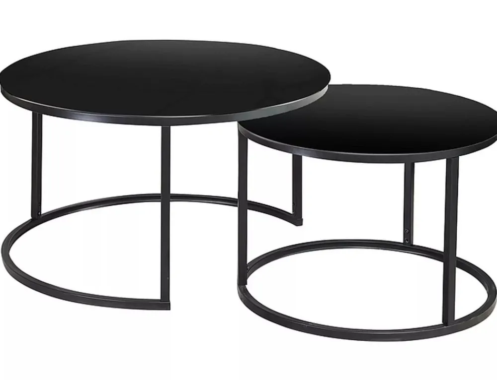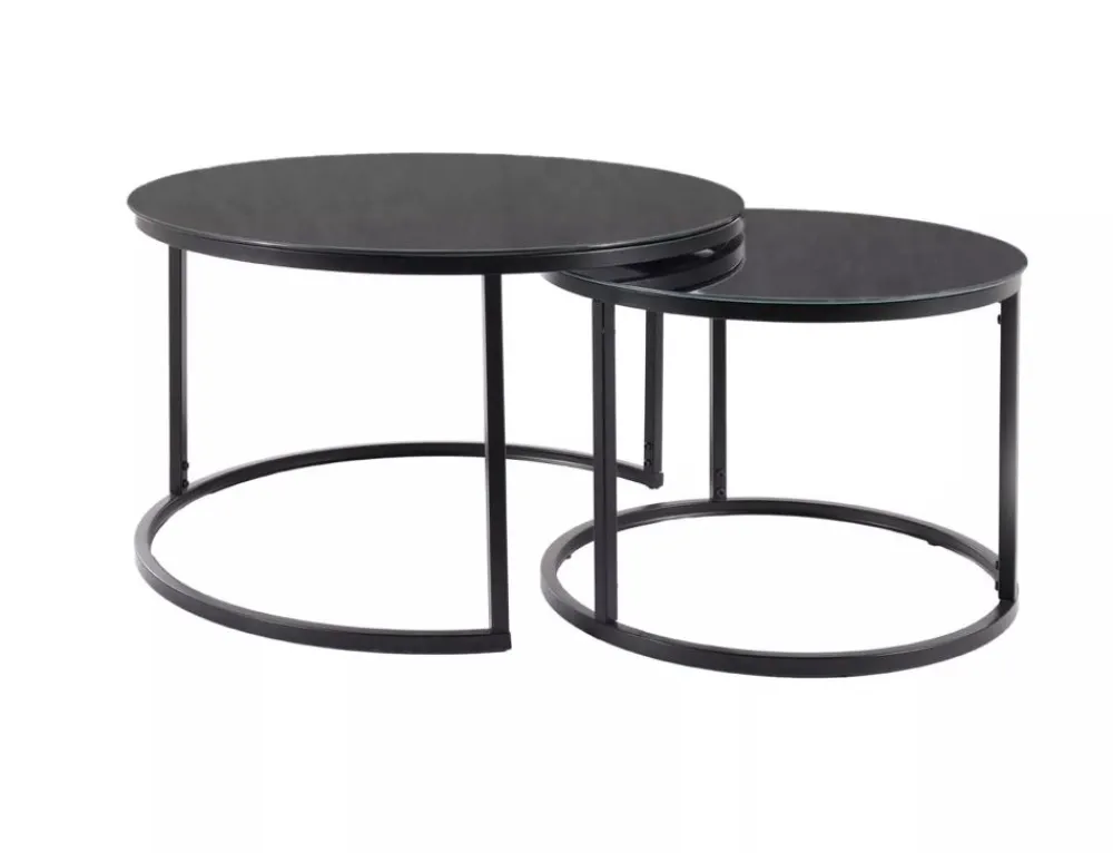 Zestaw ław, blat: szkło, stelaż: metal, kolor: czarny / czarny mat. Wymiary mniejszego stolika fi: 60, h-42cm.