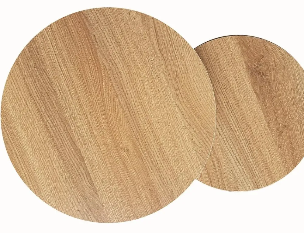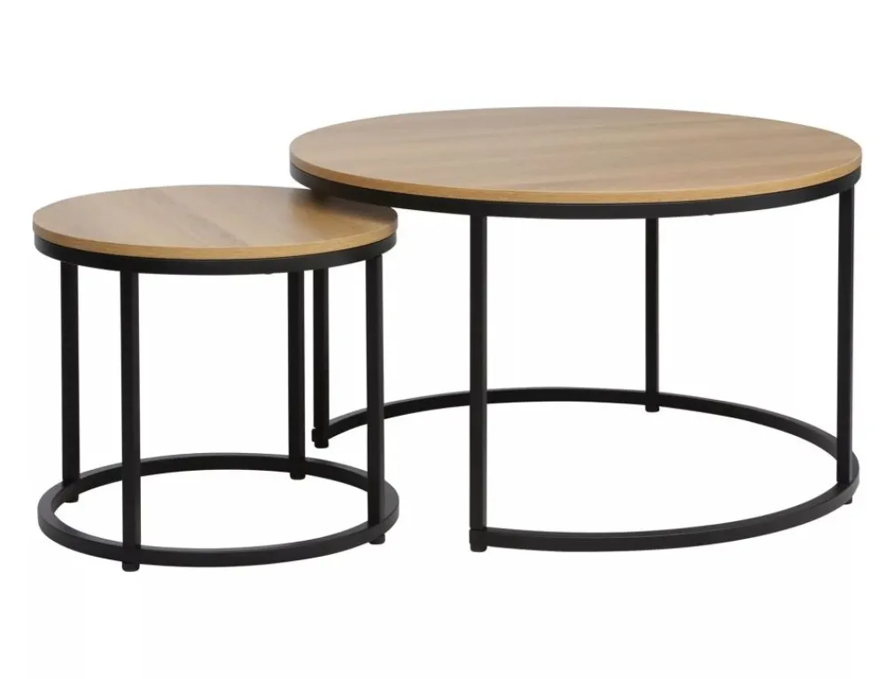 Zestaw ław, blat: płyta laminowana, stelaż: metal, kolor: dąb / czarny mat. Wymiary mniejszego stolika: średnica 48; wysokość: 42cm.